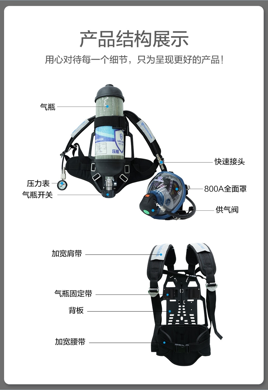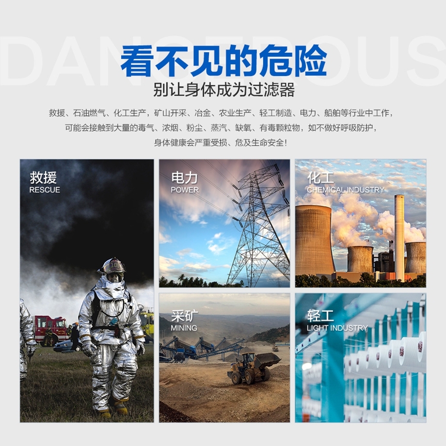 此款产品具有重量轻、体积小、性能可靠、安全程度高、佩戴舒适、呼吸舒畅、视野广阔、适应性强、操作维护方便等优点,是从事抢险救灾、灭火作业理想的个人呼吸保护装置。广泛用于化工、船舶、石油、冶炼、仓库、实验室、矿山等行业,使抢险救援人员在浓烟、毒气、蒸汽或缺氧的各种环境中可以安全有效地进行灭火、抢险、救灾和救护工作;