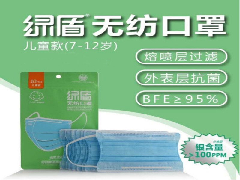 绿盾7-12岁儿童使用 无纺口罩 。