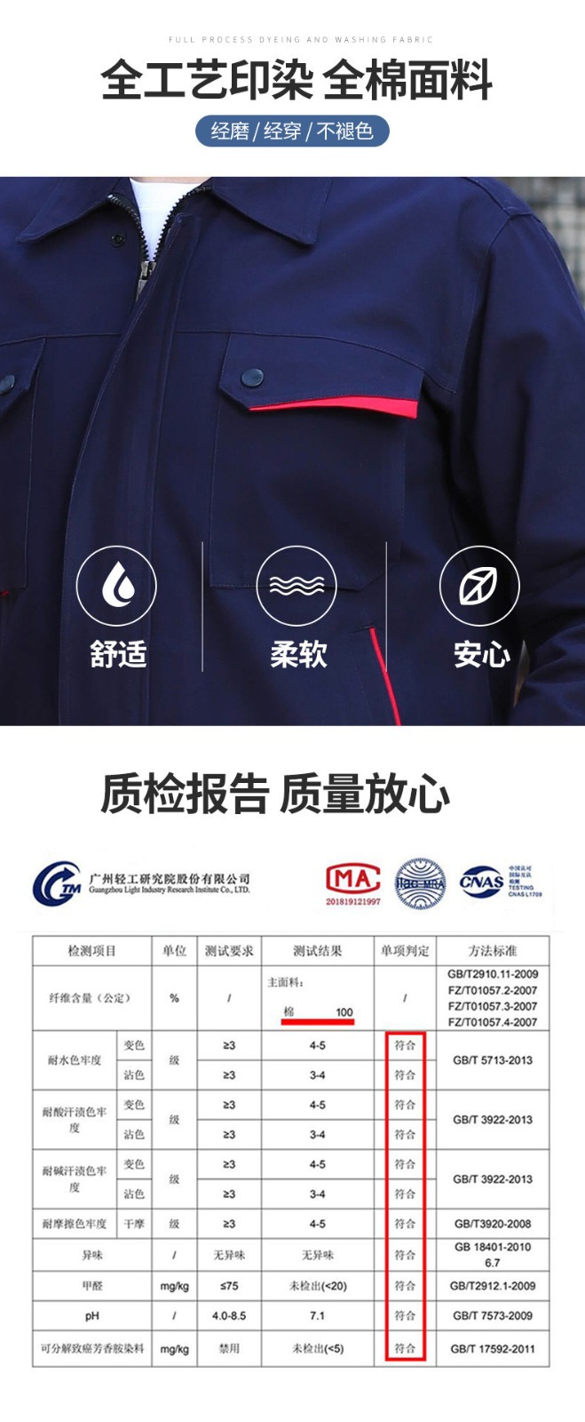 • 商品名称:君御JY-纯棉SL703夏季全工艺全棉薄款全棉长袖工作服套装艳兰色