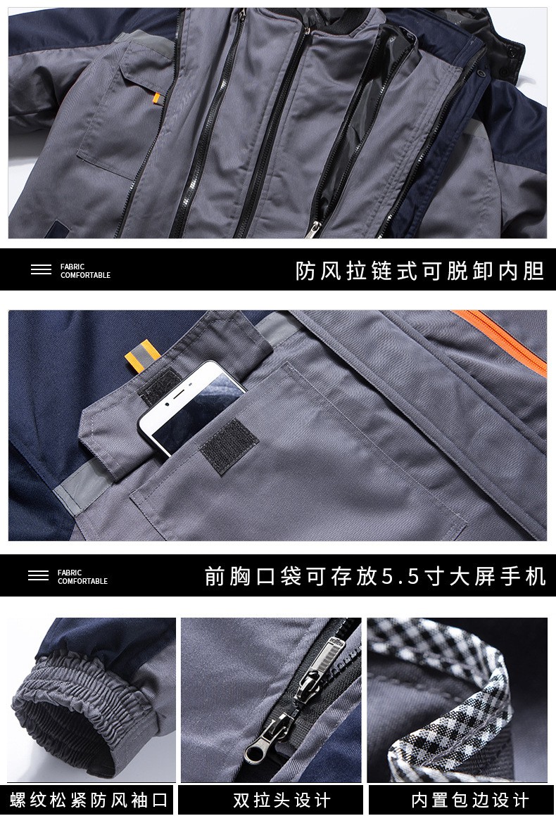 • 商品名称:君御JY-M1008冬季全工艺涤棉加厚工作服糖果五代棉服上藏蓝下灰
