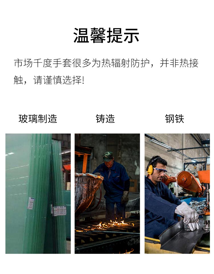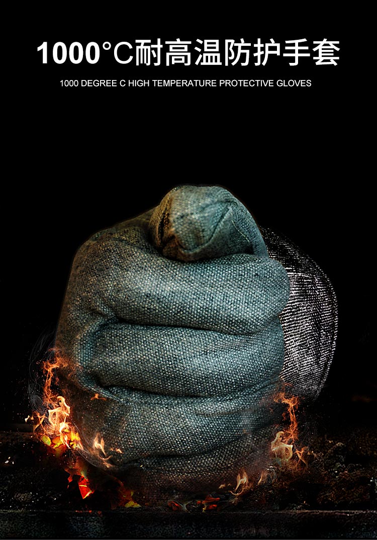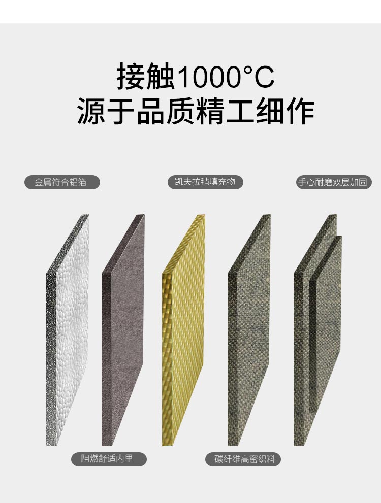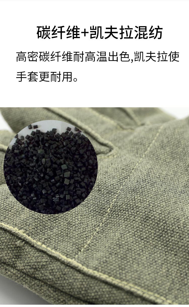 手套材质为芳纶1414碳纤维高密混纺,碳纤维含量多耐高温性能强,隔热优越。