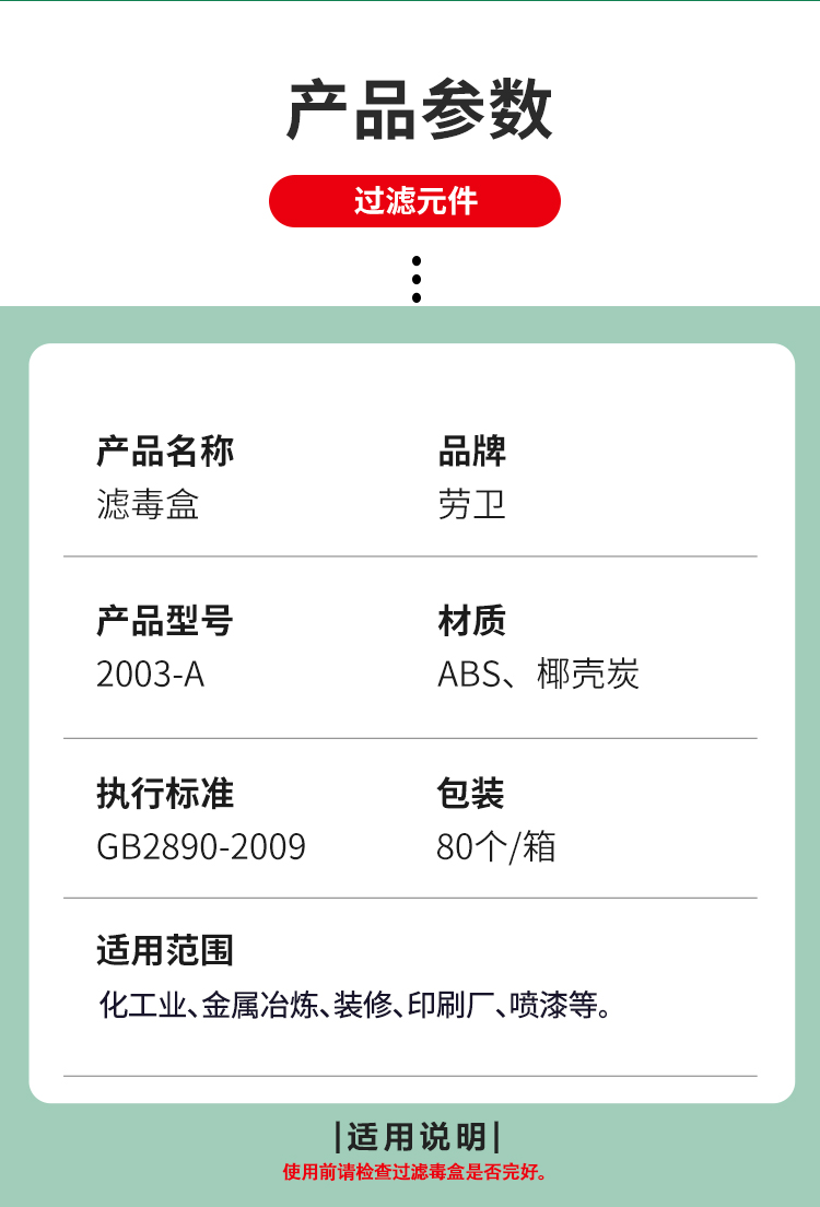 用于防护有机气体或蒸气(苯、氯气、丙酮、醇类、苯胺类、二氯化碳、四氯化碳、三氯甲烷、溴甲烷、氯甲烷、硝基烷、氯化苦等);