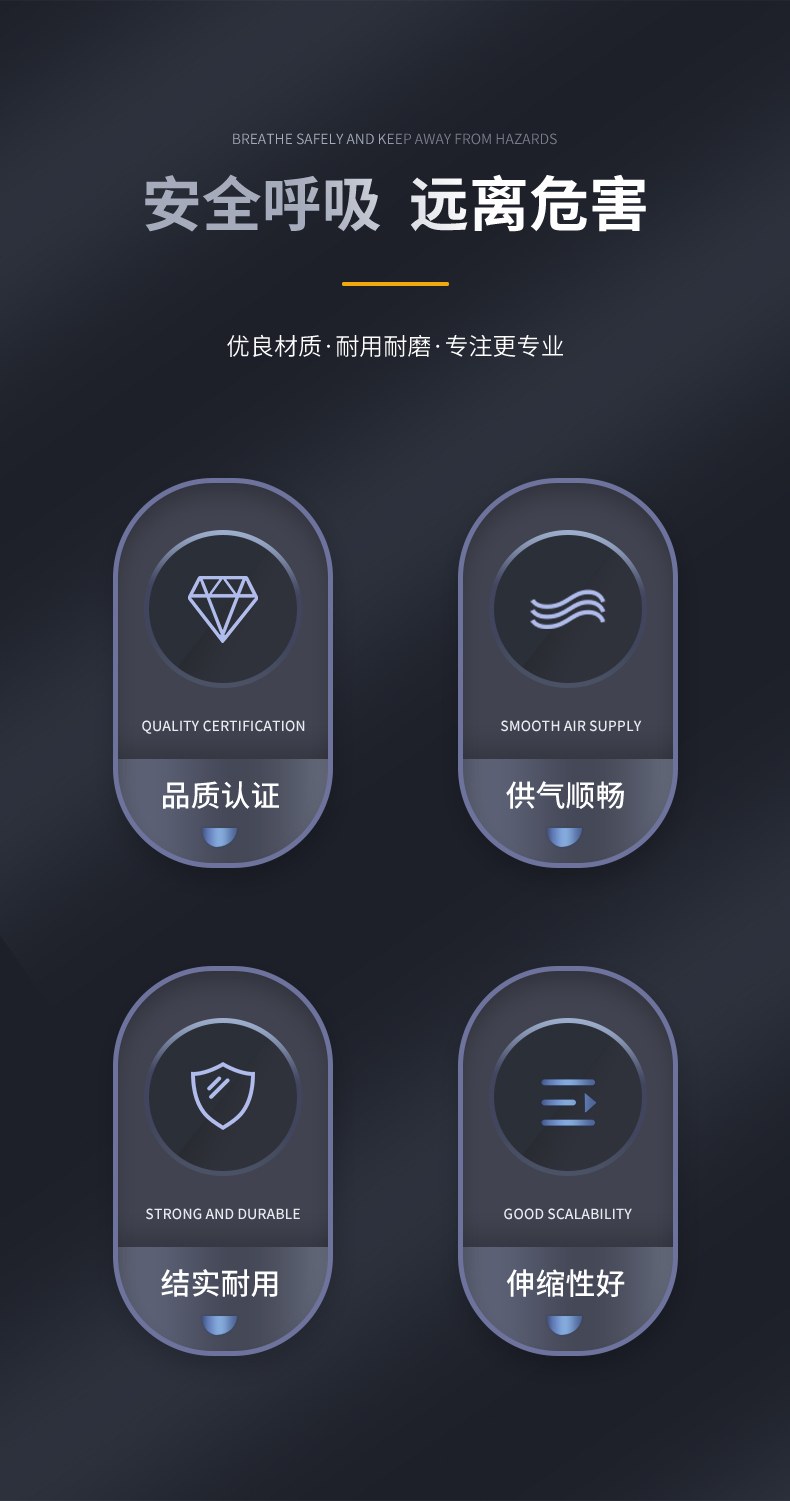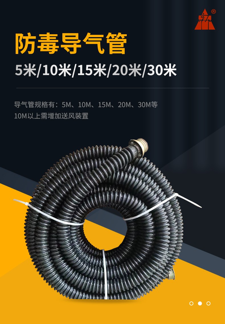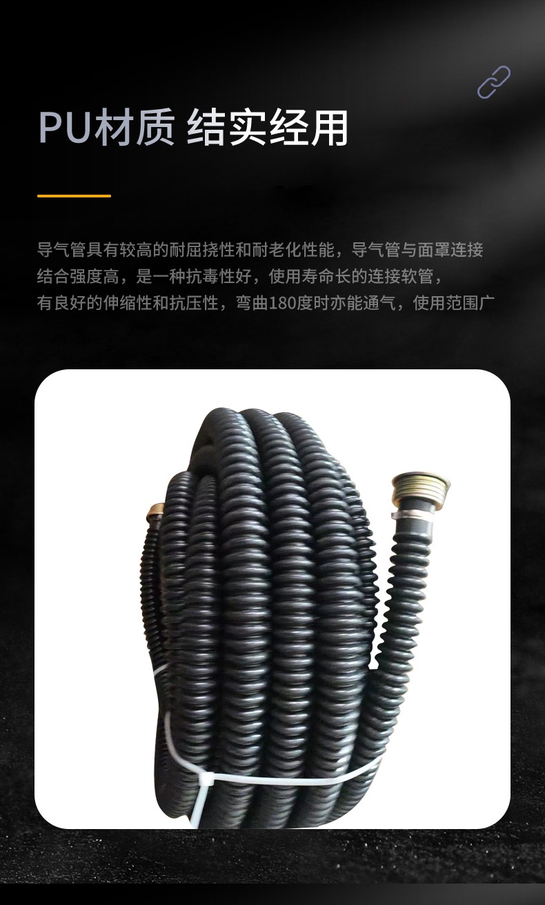 导气管具有较高的耐屈挠性和耐老化性能,导气管与面罩连接结合强度高,是一种抗毒性好,使用寿命长的连接软管,管体柔软,具有良好的伸缩性和抗压性,弯曲180度时亦能通气,使用范围广;