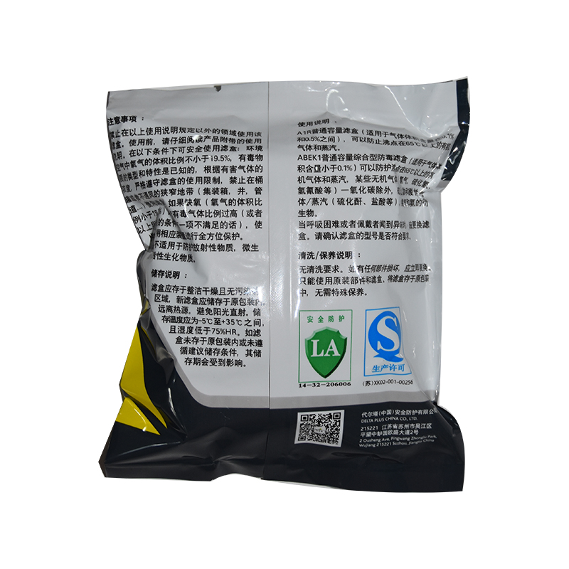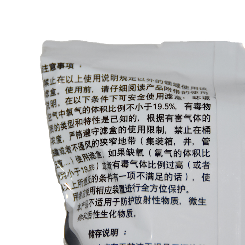 低容量综合型防毒滤盒(适用于气体体积含量小于 0.1%)可以防护沸点在 65℃以上的有机气体和蒸汽,某些无机气体 (氯气、硫化氢、氢氰酸等)一氧化碳除外,硫化物和酸性气体 /蒸汽(硫化酐、盐酸等),氨气和氨的衍生物;