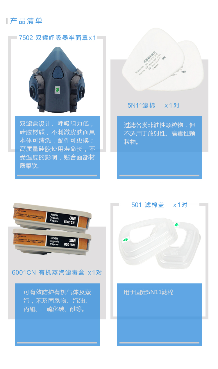 套装包含:3M 7502 双罐防毒半面罩1个、6001CN 有机蒸汽滤毒盒1对、5N11滤棉1对、501滤棉盖1对。
