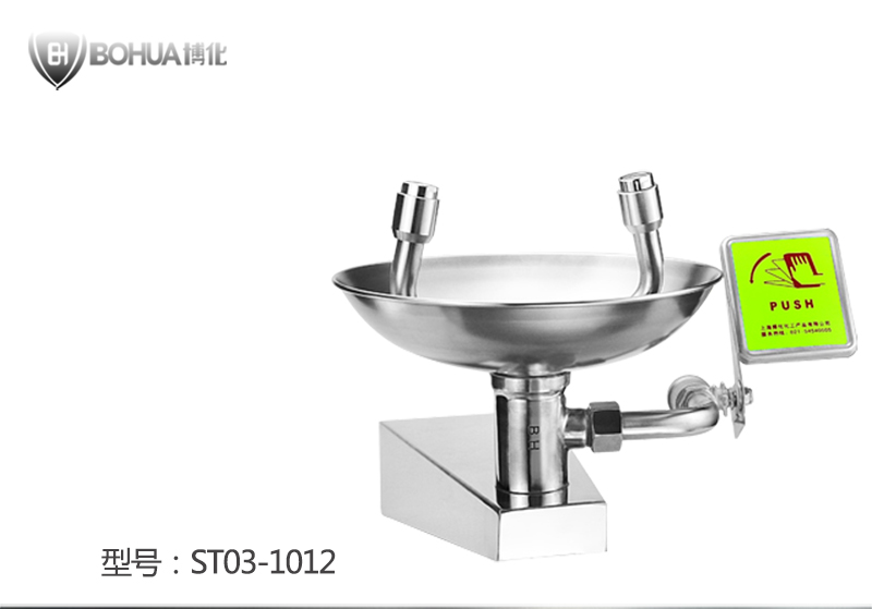 洗眼器:推开手推柄,气雾状洗眼水1秒种之内喷出,出水高度和角度按照人的面部比例设计,洗眼流量12-18L/min可调节,工作压力0.2-0.4MPA;