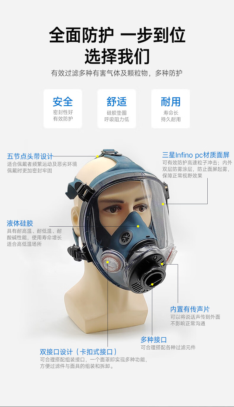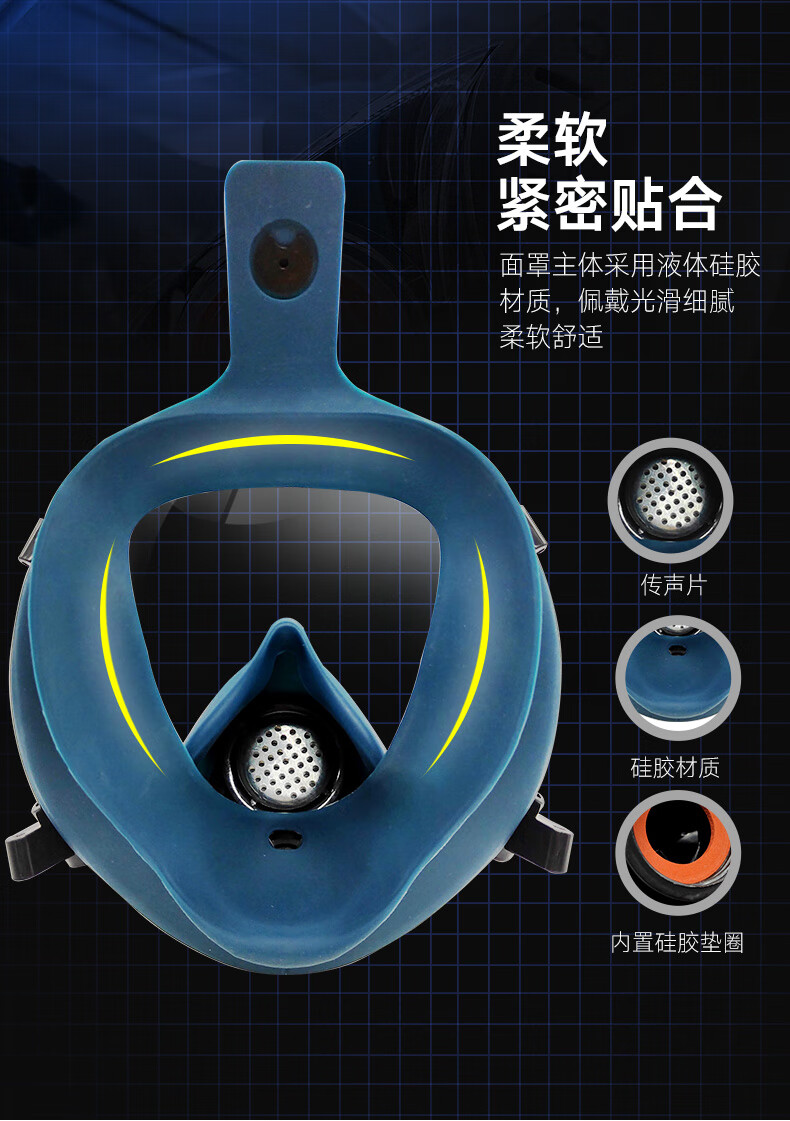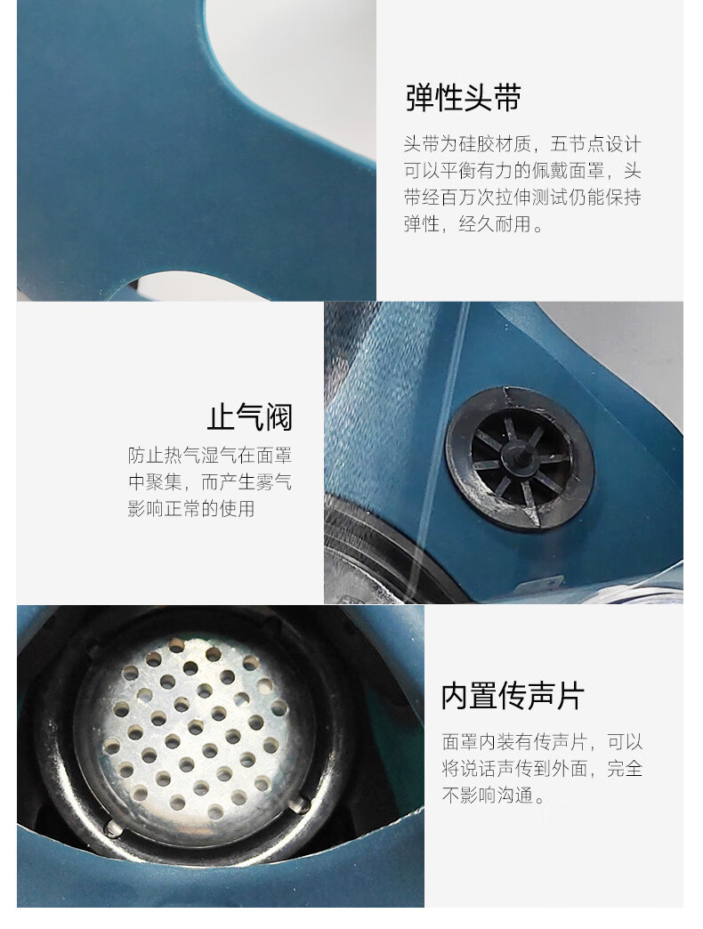 头戴为硅胶材质,五节点设计,可以平衡有力的佩戴面罩,头带经百万次拉伸测试仍能保持弹性,经久耐用。