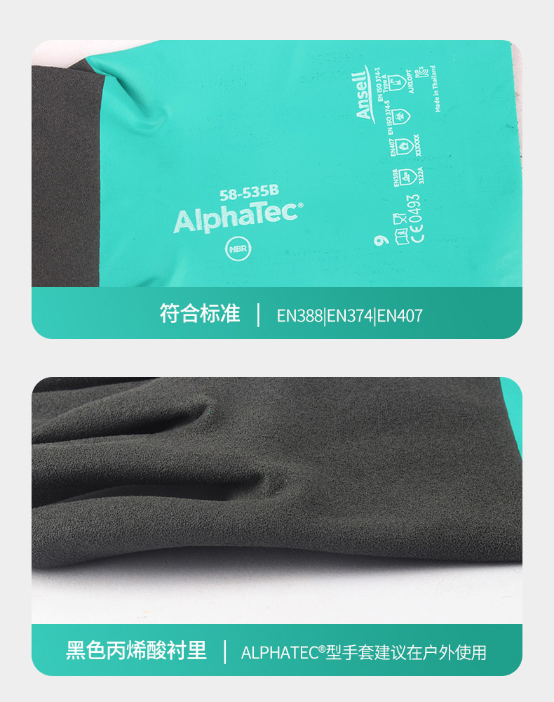 采用黑色丙烯酸衬里的AlphaTec®型手套建议在户外使用;