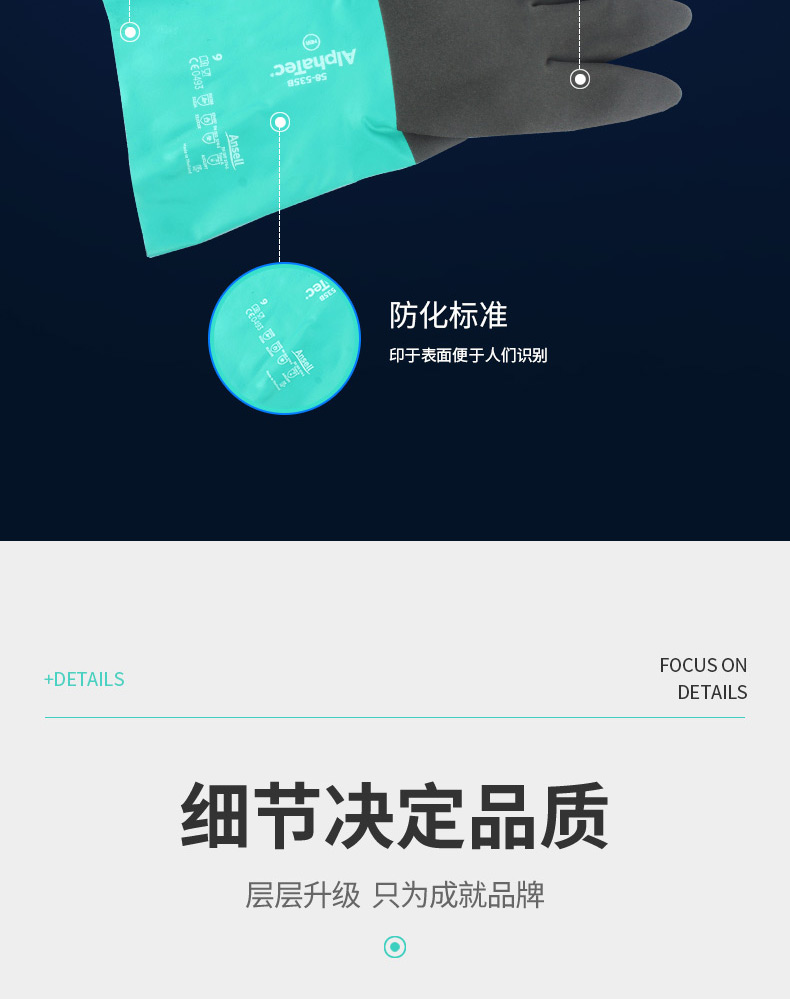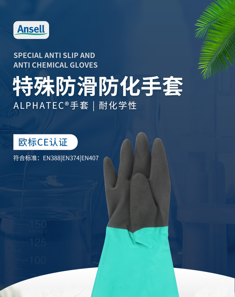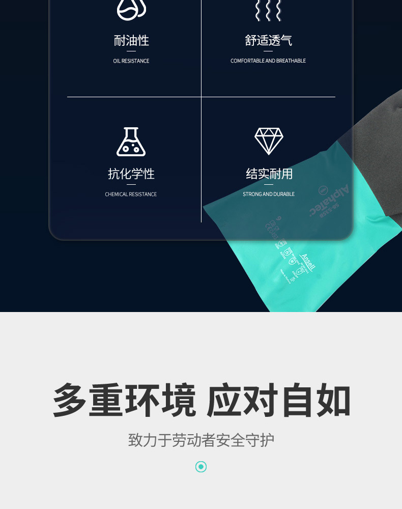 AlphaTec®手套采用革命性的安思尔抓握™技术,使用户可以更小的抓握力操作潮湿或油腻物体,同时提高控制性。 液体隔离的耐化学性与抓握性能的独特结合以及柔韧性和灵活性使AlphaTec® 手套成为处理化学品相关工作时的明智选择;