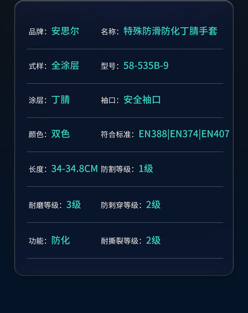提供可靠的化学防护,提高用户安全性。 获得特色的安思尔抓握技术™确保聚合物涂层在生产过程中不会渗透衬里。 因此,该涂层一致、可靠,从而大大降低化学品泄漏到皮肤的可能性;