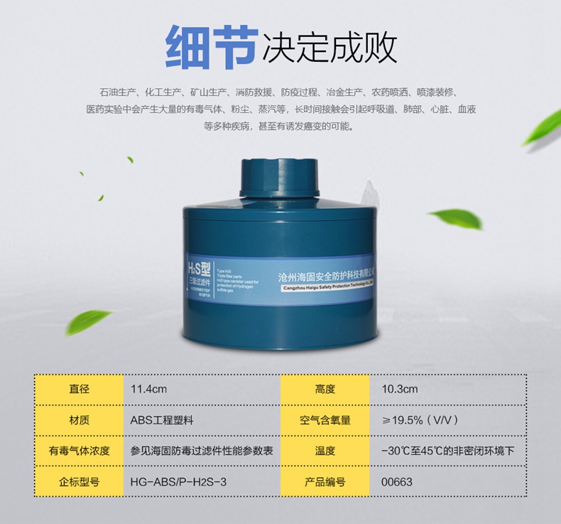 ● 选用推荐:适用于污水处理,金属精制、造纸,染料,橡胶,农药、医药、化学实验等产生硫化氢气体的环境,如污水厂作业可佩戴本滤毒罐防护。