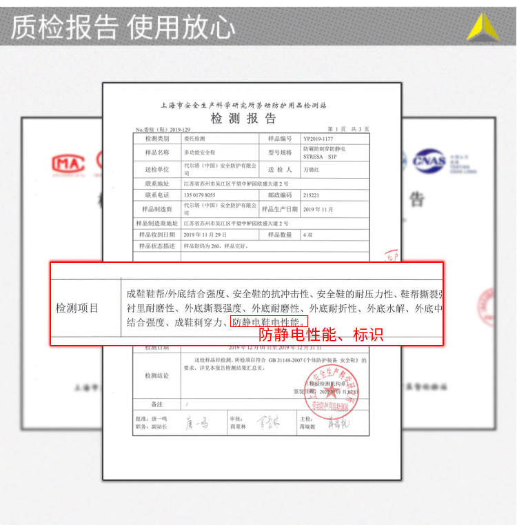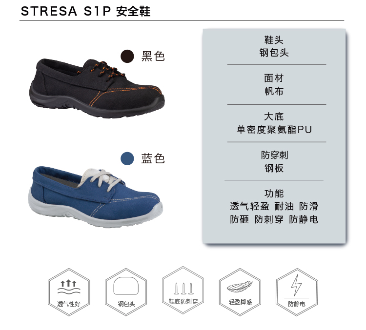 防砸、防刺穿、防静电、后跟减震、耐磨、耐油、SRC级防滑。
