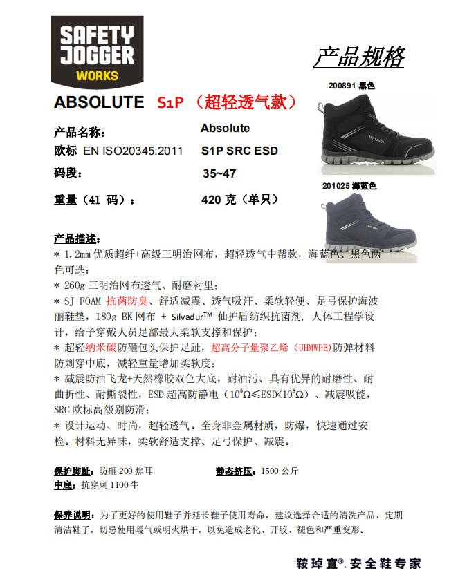 • 商品名称:Safety Jogger鞍琸宜 ABSOLUTE S1P 200891 纳米碳包头 防砸防刺穿防静电安全鞋黑色