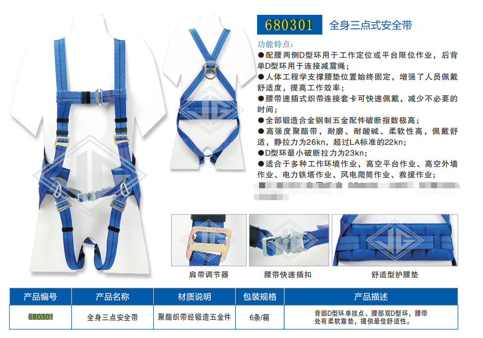 配腰两侧D 型环用于工作定位或平台限位作业,后背单D 型环用于连接减震绳;