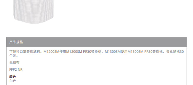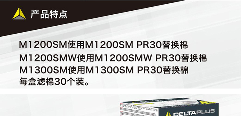 ●本产品为可替换口罩替换滤棉(不含罩体),适用于代尔塔蜘蛛面罩,M1200SM使用M1200SM PR30替换棉。