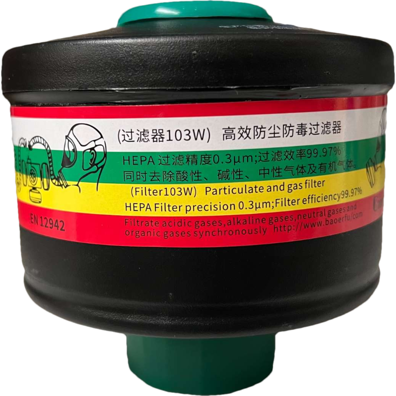 该产品(PRF-103RM4)是一款配密合型全面罩的电动送风过滤式防尘防毒呼吸器,主机防水喷溅,经得起严格的清洁消毒要求,可同时使用2-3个过滤罐,具有质轻、佩带舒适、配有舒适宽腰带及双肩带,腰带及肩带可自由调节、符合人体工程学设计,使重量更能平均分布,全身受力、使用方便、它集呼吸防护,面部皮肤及眼睛防护于一体,、密封性好、过滤精度高,送风量大、过滤精度0.3μm,大流量160-280L/Min,风量可自由调节(顺时针调大风量,逆时针调小风量),7--20小时工作电池(可充电聚合物锂离子电池),调节呼吸器到最大风量时,电池连续供电7小时,调节呼吸器到最小风量时,电池连续供电20小时,如连续工作时间超过7-20小时应配备用电池。主机上有电量显示液晶屏,有清晰的电量显示,并且电池低电量蜂鸣报警。全面罩防雾工艺,与脸部密封严实,既使电动呼吸器意外故障,也可相当于普通负压防尘防毒面具,呼吸安全更可靠,是预防尘肺病及其它呼吸性职业病的最佳个人防护用品。