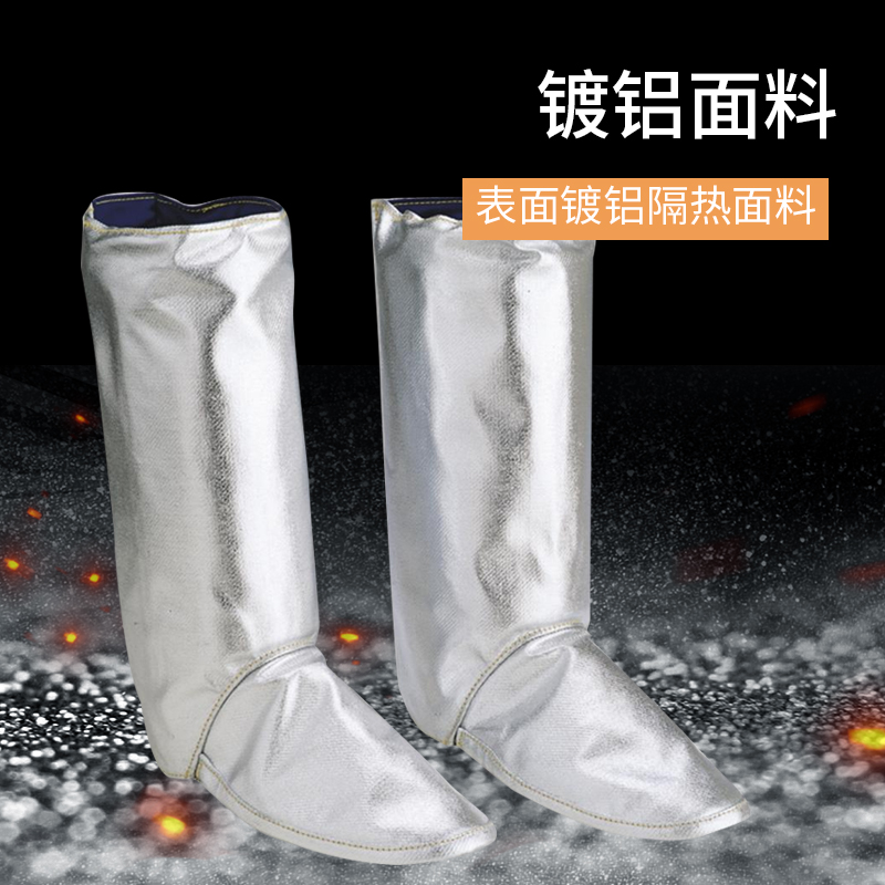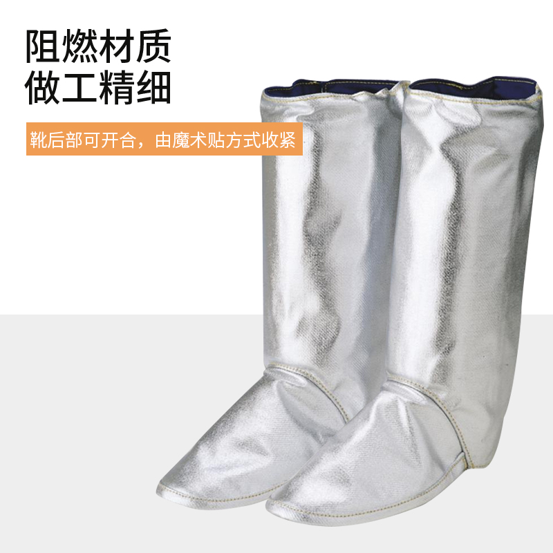 隔热防溅射套靴,表面覆有镀铝反光膜,内衬为Proban®棉纤维,后部有开口,并附有粘边,本套靴可保护工人免受高温伤害;