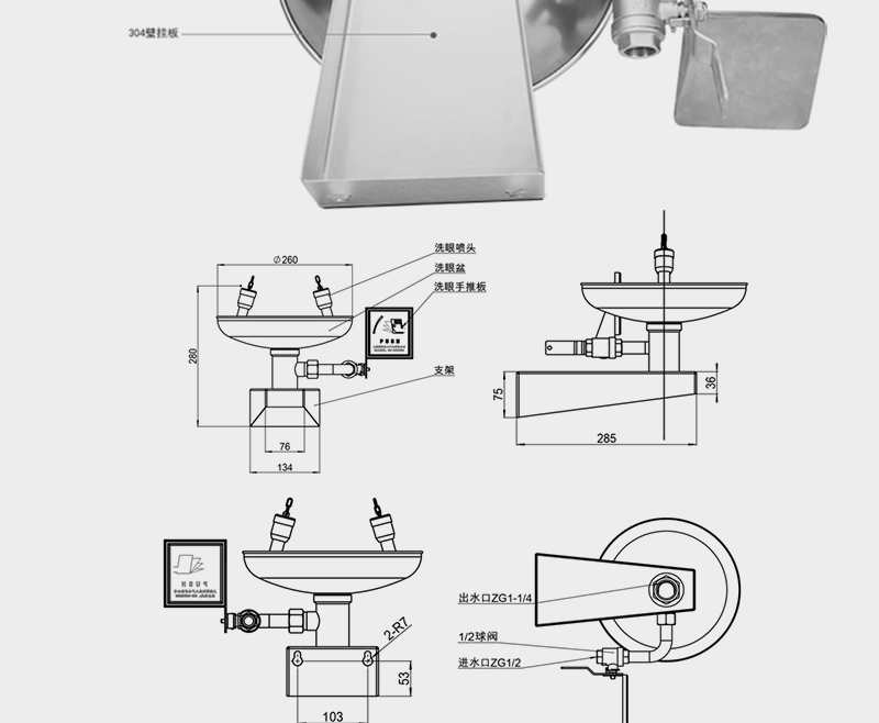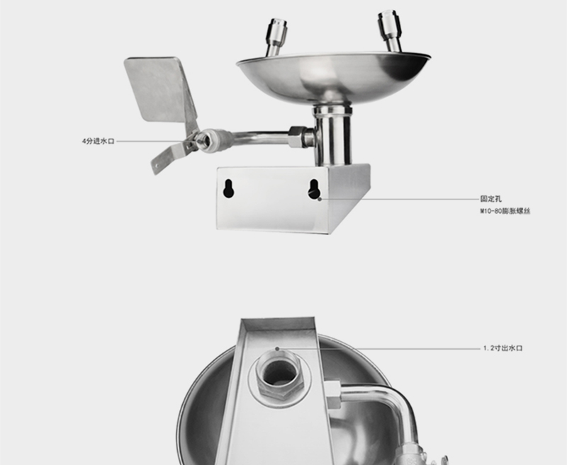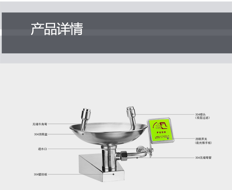 洗眼器:推开手推柄,气雾状洗眼水1秒钟之内喷出,出水高度和角度按照人的面部比例设计,洗眼流量12-18L/min;