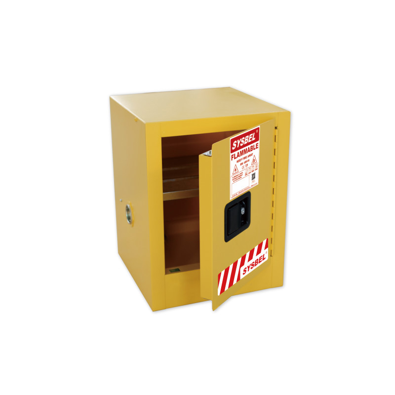 SYSBEL高品质易燃液体安全柜由双层18 Ga(1.2-mm)钢板通过点焊接构造,两层之间相隔38mm的形成良好的防火绝缘层;