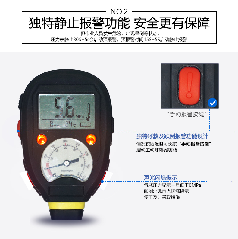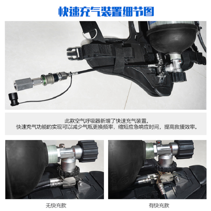 2.气瓶:为铝内胆碳纤维全缠绕复合气瓶,压力30MPa,具有质量轻、强度高、安全性能好,储气量打,使用时间长,瓶阀具有高压防护装置。