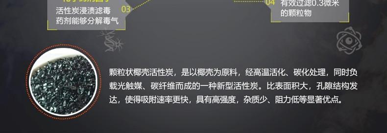 内置自主研发椰壳活性炭,浸渍多种化学药剂,吸附速度快,吸附容量高;