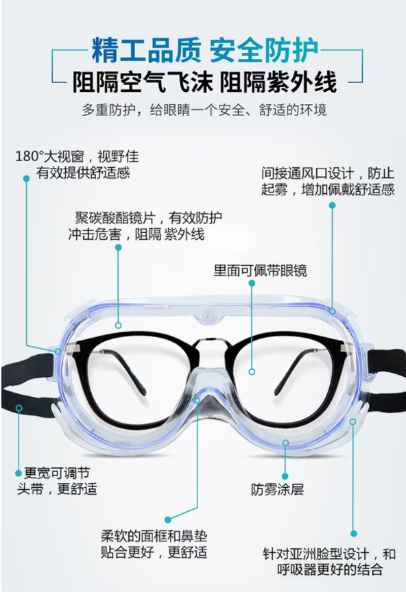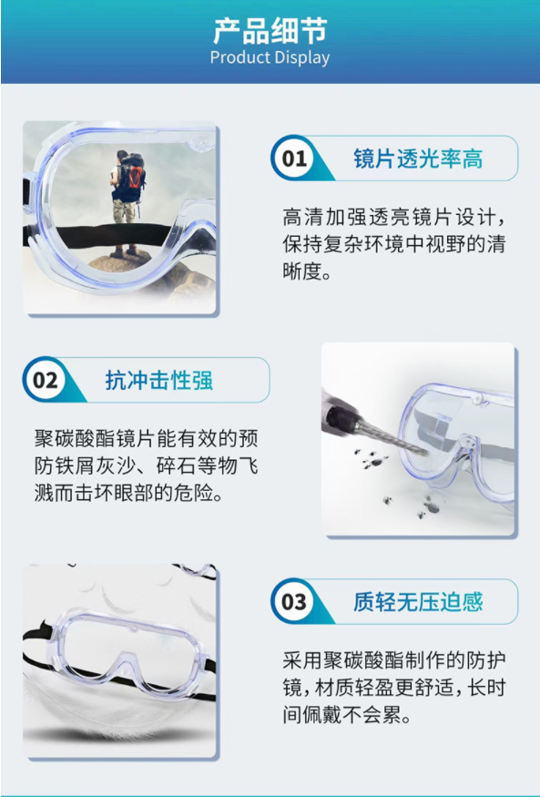 聚碳酸酯镜片,有效防护冲击危害,阻隔紫外线、防雾涂层 。