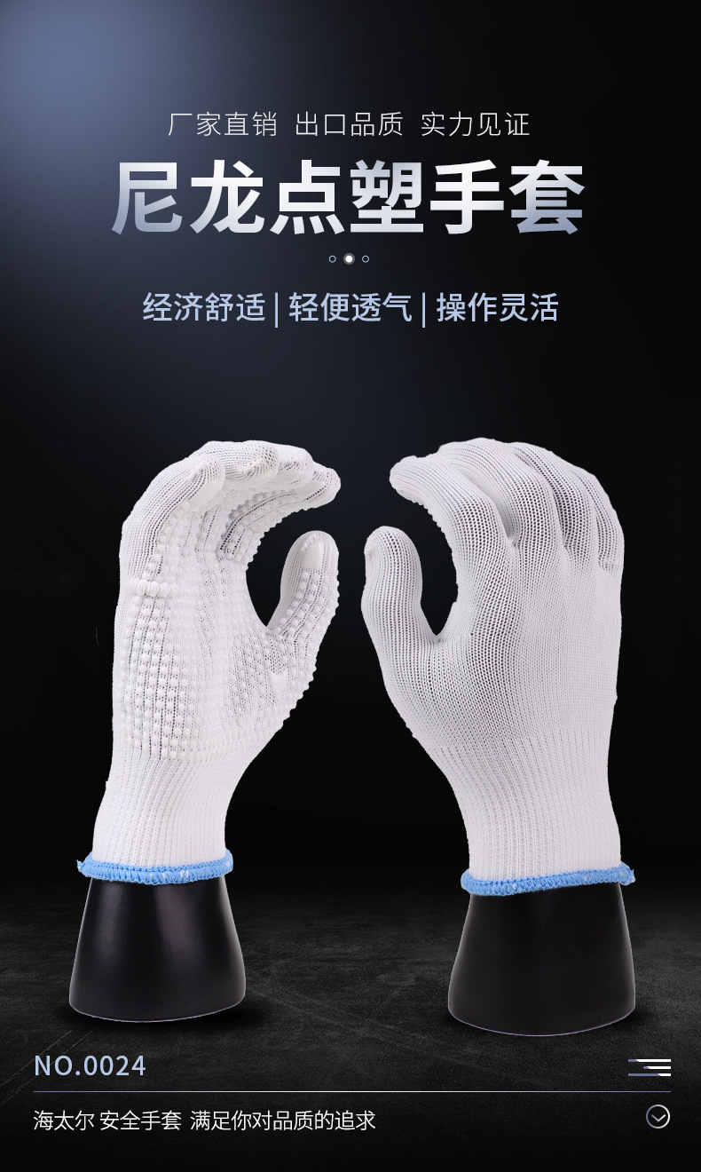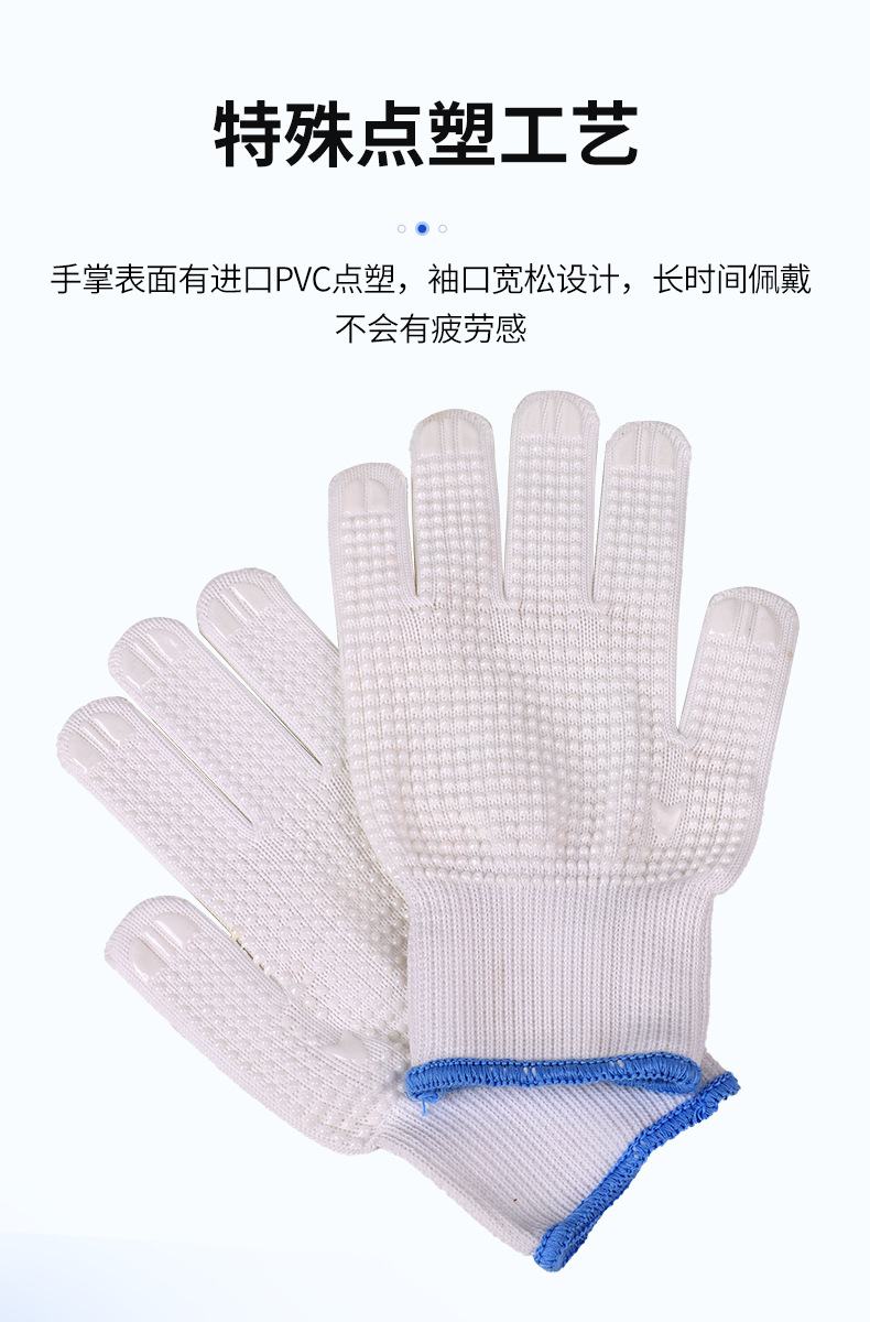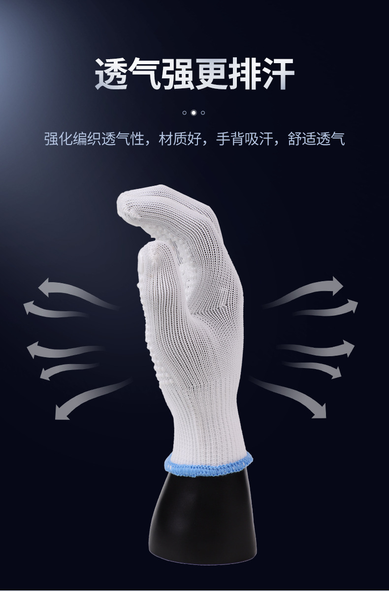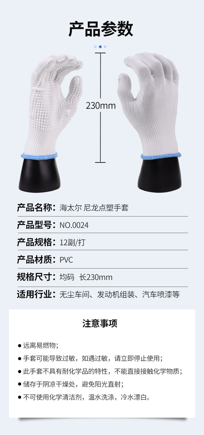 本产品采用进口尼龙,经本公司特殊工艺,由进口手套机精编而成,手掌表面点有进口PVC点塑,袖口宽松设计!手感舒服、无尘、透气止滑,长时间配戴不会使双手有疲劳感等;