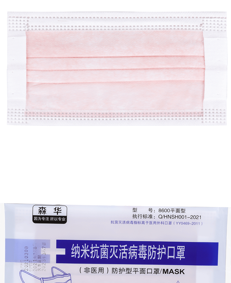森华 8600平面型抗菌灭活病毒防护口罩宽耳带。