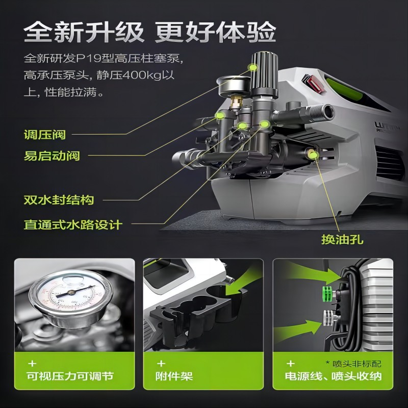 感应电机,爆发力强,3柱塞金属泵,电机功率2000W,额定流量8L/min,最大流量10L/min,额定压力100bar,最大压力140bar,水型可调节,多角度洗车,关枪停机系统,节能必备,压力可调节,可视压力表,