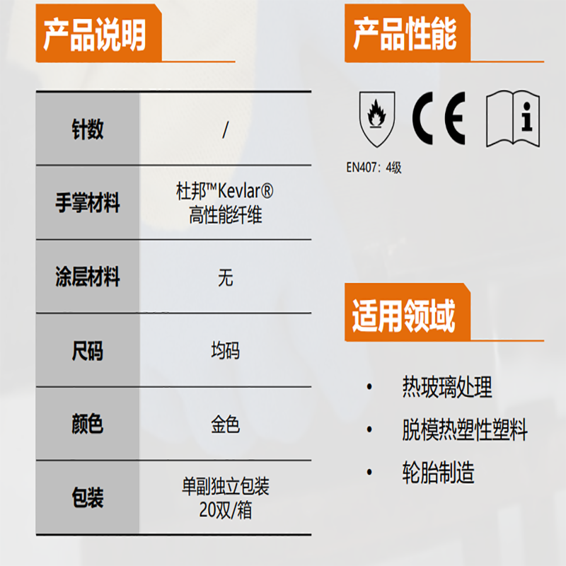 采用杜邦™Kevlar®高性能纤维编 织而成,既耐高温也耐切割;