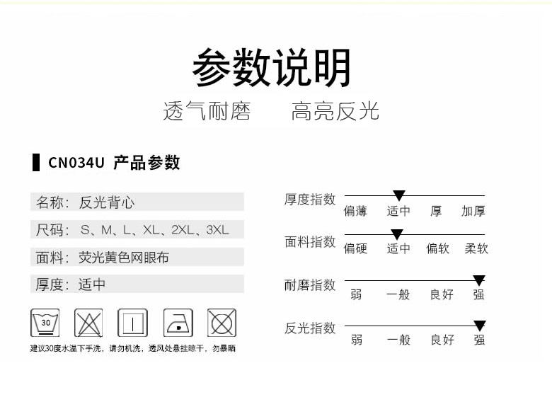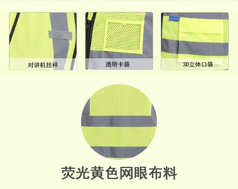 105g网眼布背心,对讲机挂袢、透明口袋、3D立体口袋;