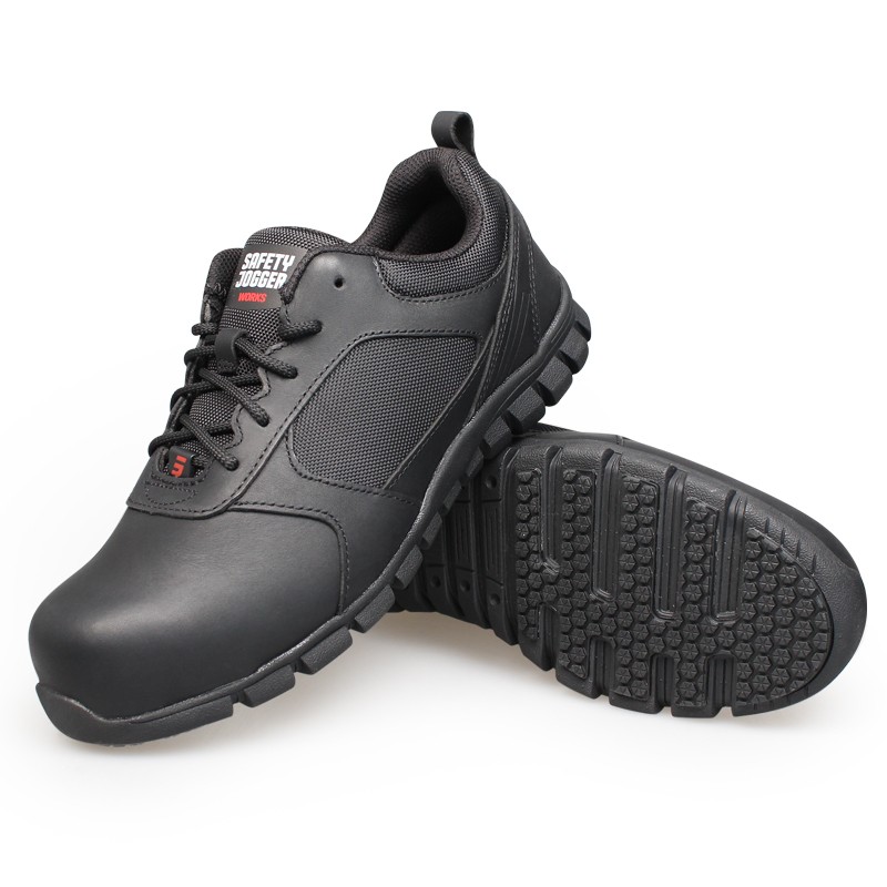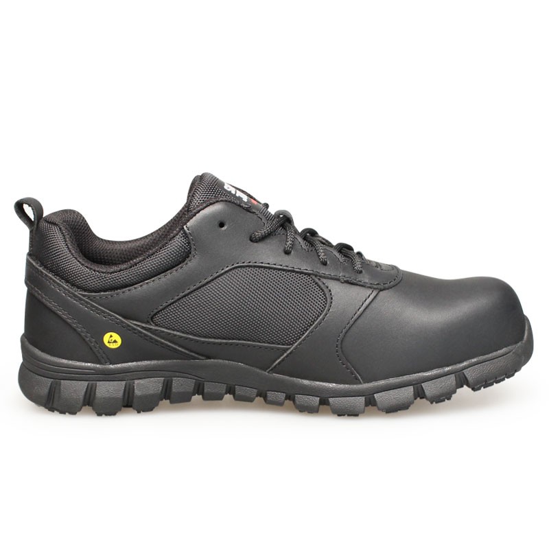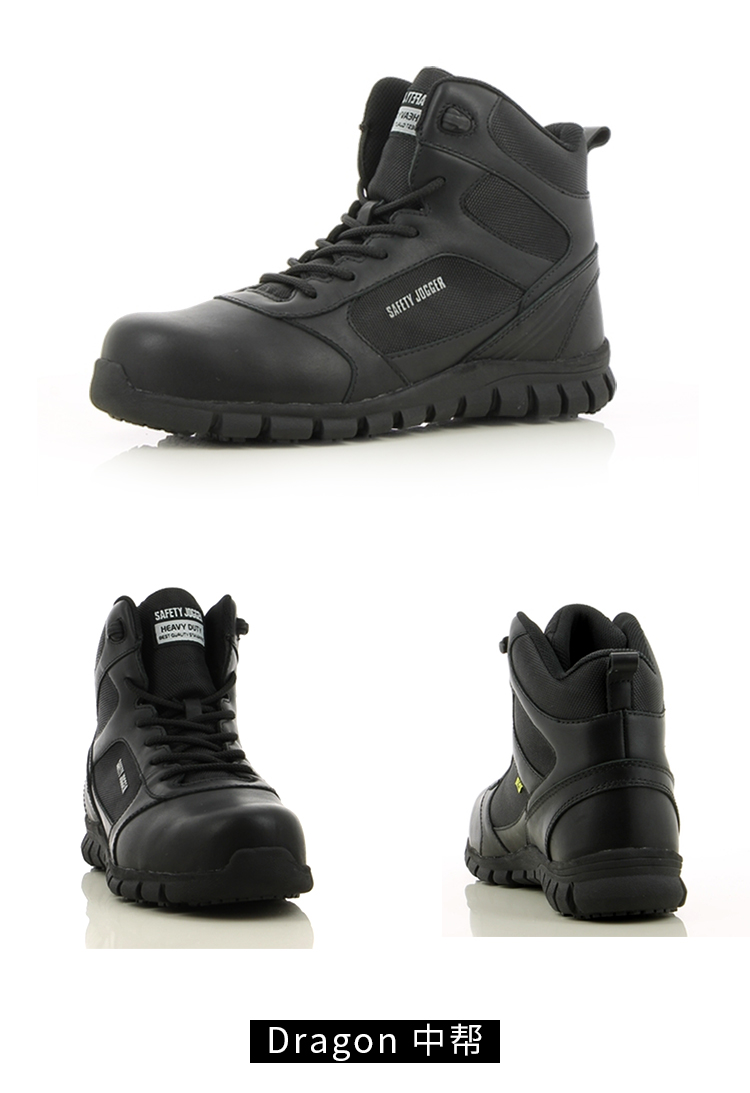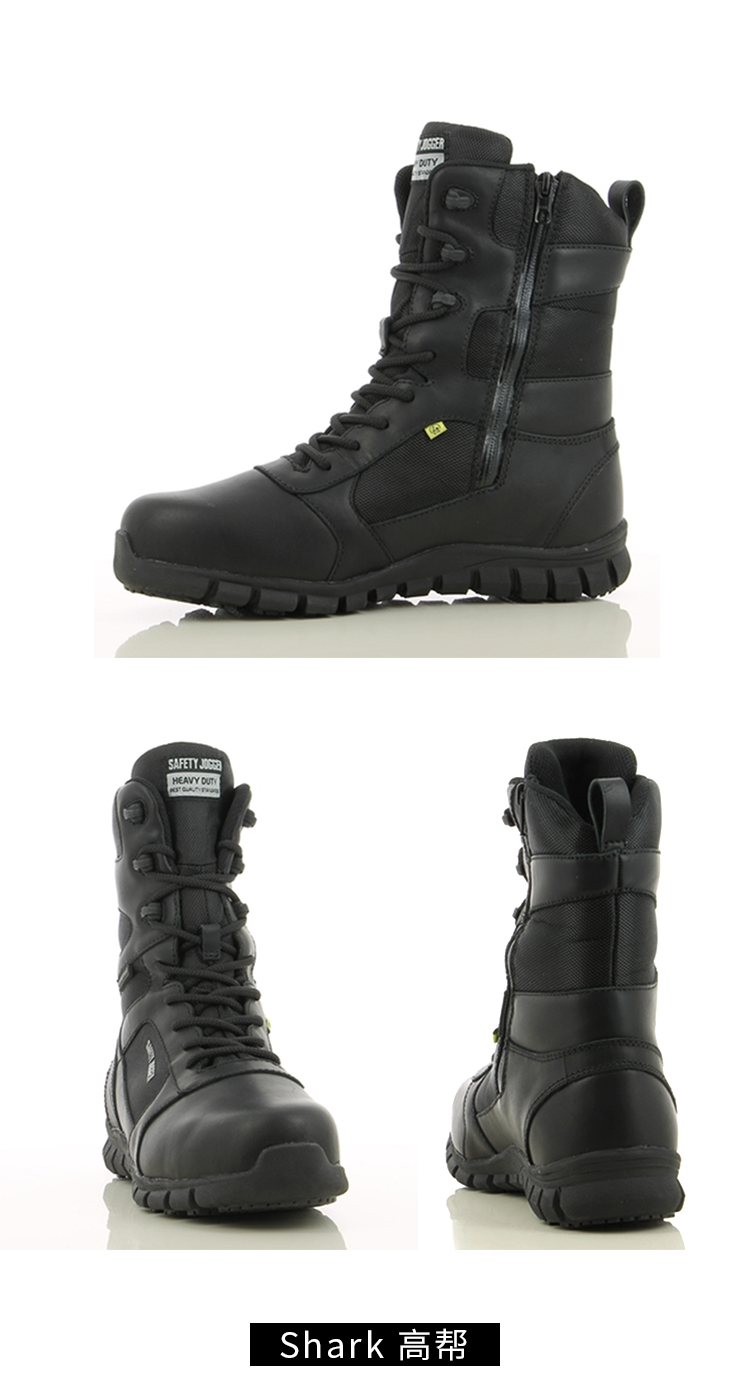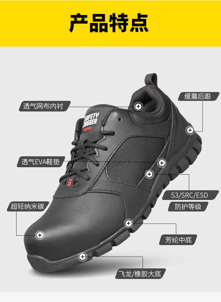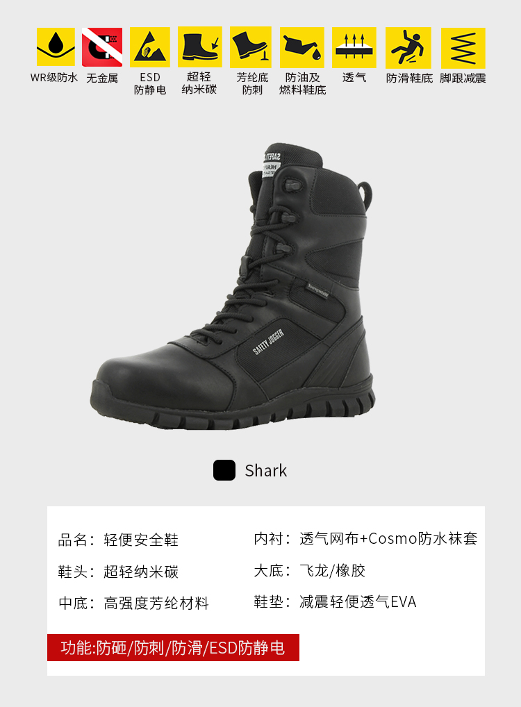 减震防油飞龙+天然橡胶大底,耐油污、具有优异的耐磨性、耐曲折性、耐撕裂性,ESD 超高防静电(105 Ω≤ESD< 108 Ω)、减震吸能,欧标 S3 等级防水、SRC 欧标最高级别防滑;