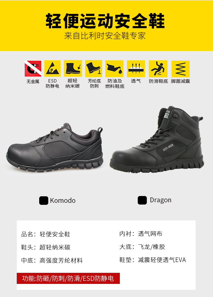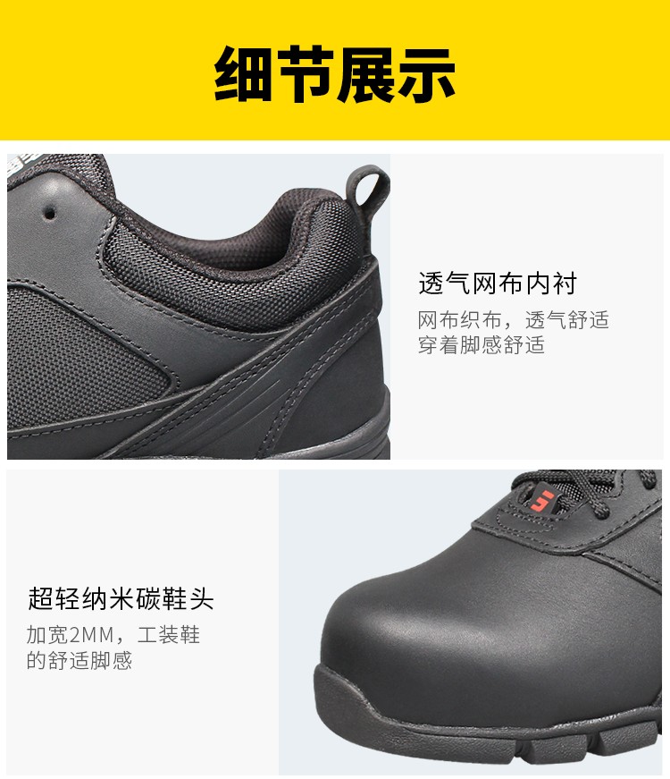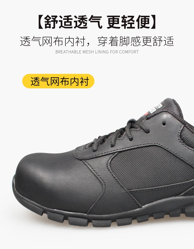 超轻纳米碳防砸包头保护足趾,超轻芳纶(高强度聚乙烯)防弹材料防刺穿中底,减轻重量增加柔软度;