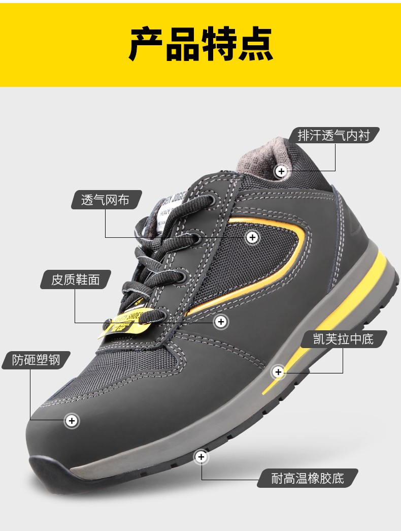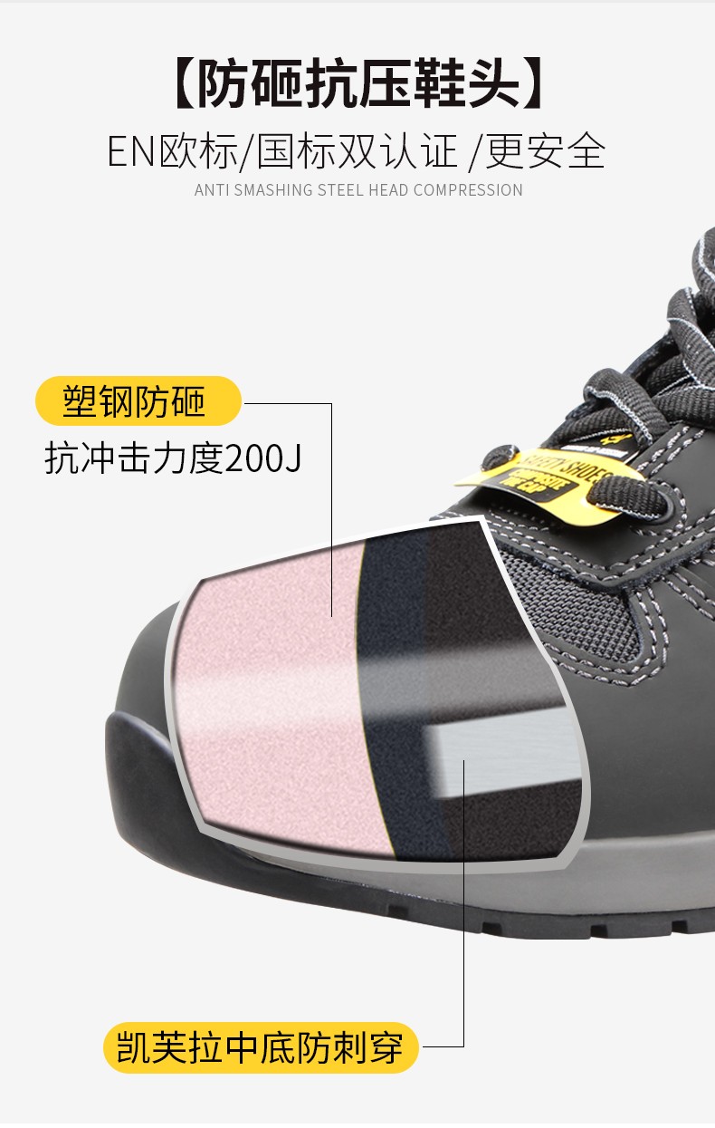 非金属复合材料防砸包头保护足趾,凯芙拉防刺穿中底,减轻重量增加柔软度;