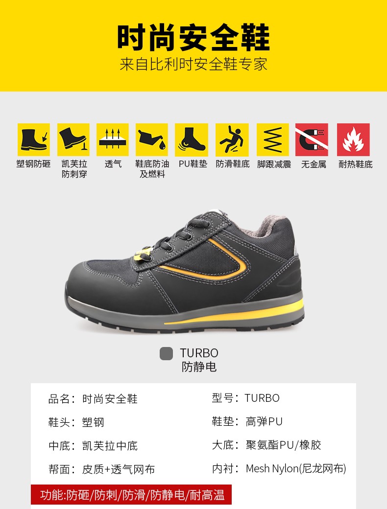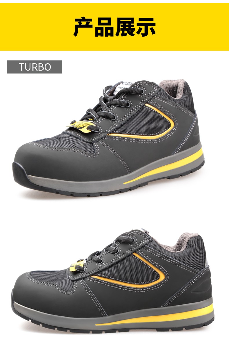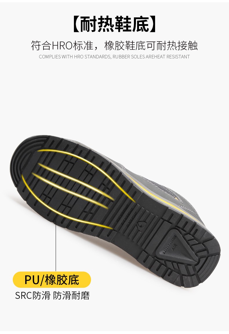 1.8mm 优质牛巴戈 +1680D 高级透气尼龙布帮面,0.8mm 黄色反光镜面PU,有助于夜间作业,低帮时尚透气运动款;