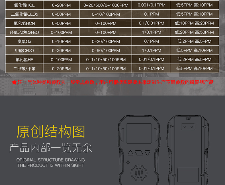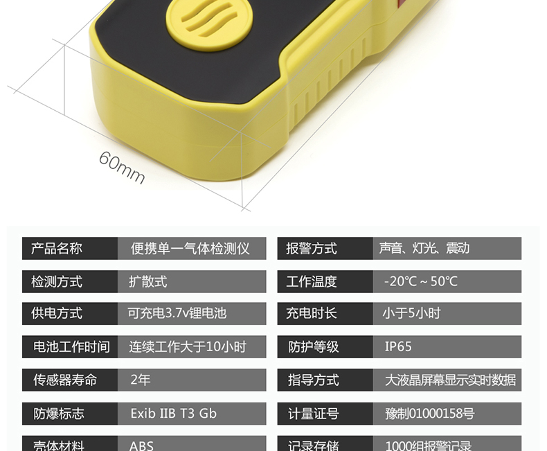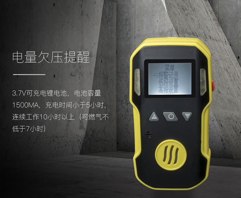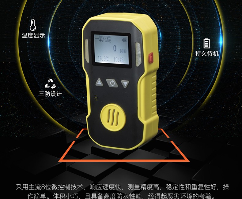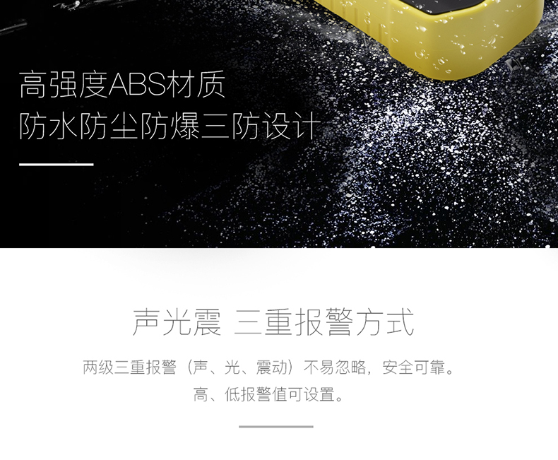 体积小巧,且具备高度防水性能,经得起恶劣环境的考验。高强度ABS材质,两级三重报警(声、光、震动)不易忽略,安全可靠。高、低报警值可设置。