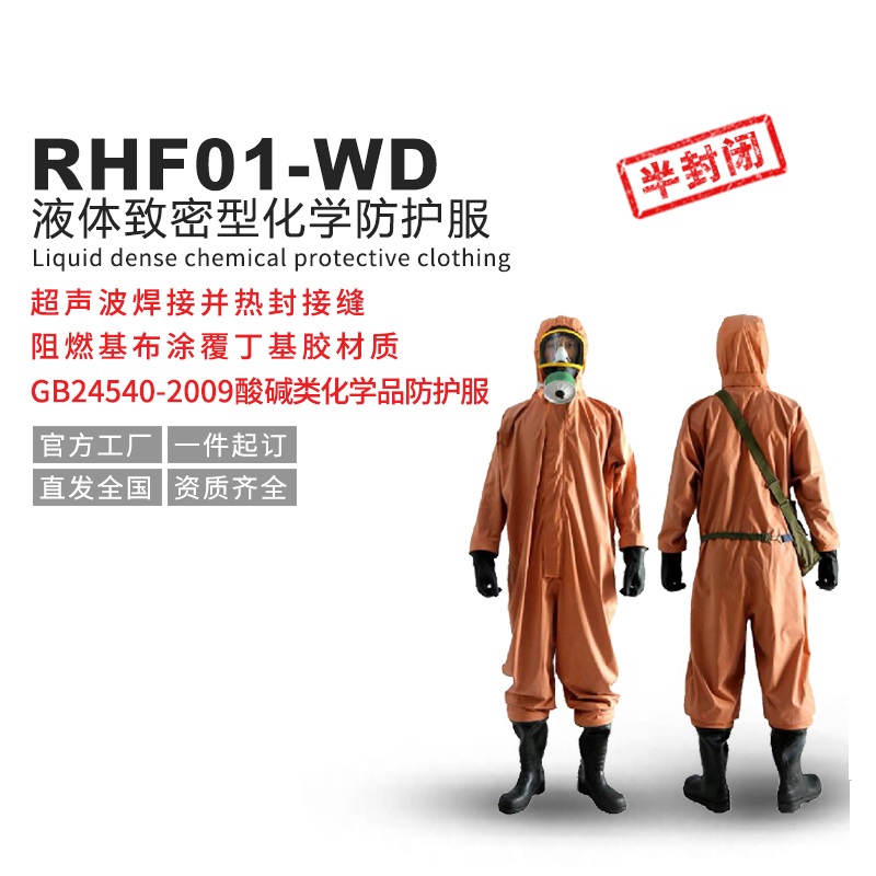 RHF01-WD液体致密型化学防护服属于外置式防护服,采用阻燃基布涂覆丁基胶材质,应用超声波焊接并热封接缝,能有效防护气体、液体和颗粒等介质。本产品与各种类型呼吸器、防毒面具配合使用,可广泛适用于化学品的防护;