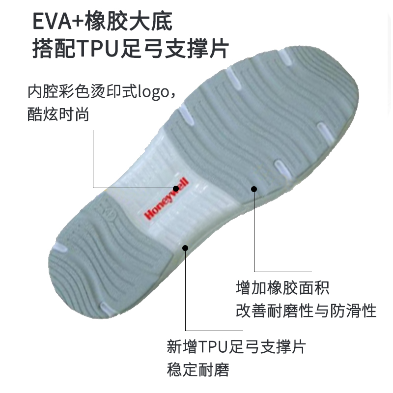 EVA+橡胶大底,搭配TPU足弓支撑片增加耐用性的同时提供良好的稳定性能。