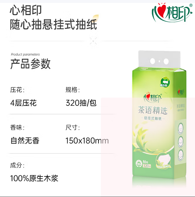 • 商品名称:心相印 DT10320 茶语挂抽纸巾悬挂式大包卫生纸擦手纸厕纸面巾纸壁挂抽纸320抽
