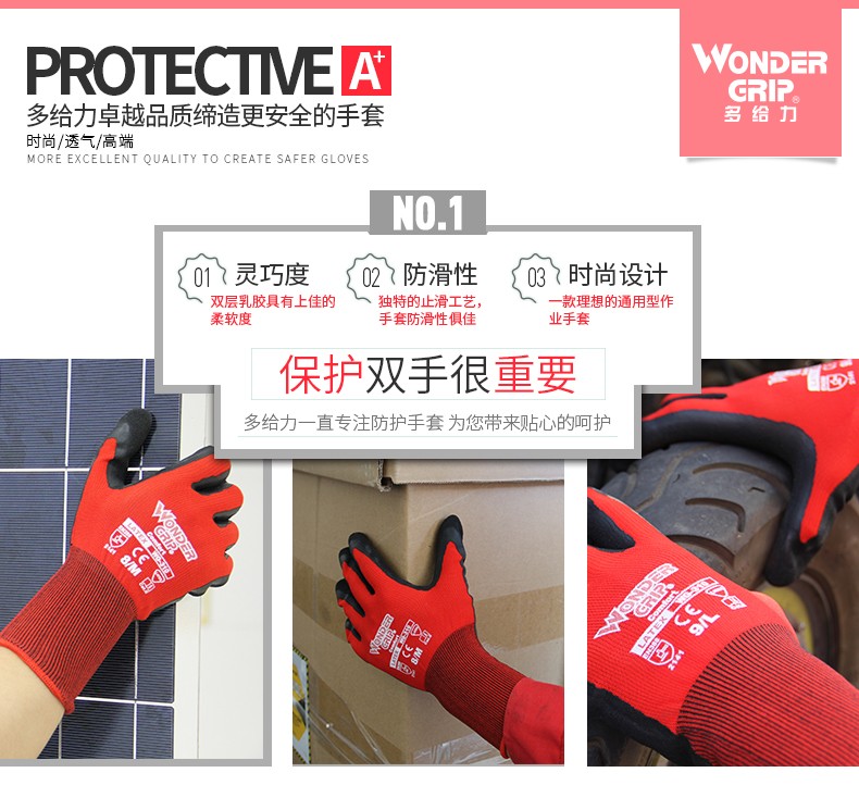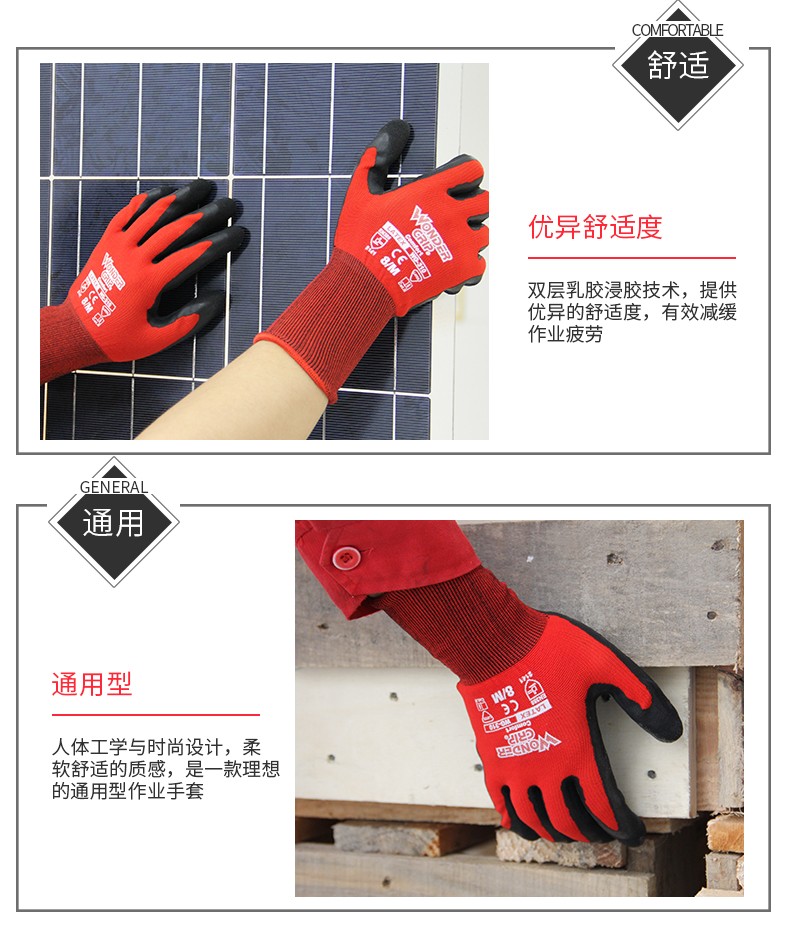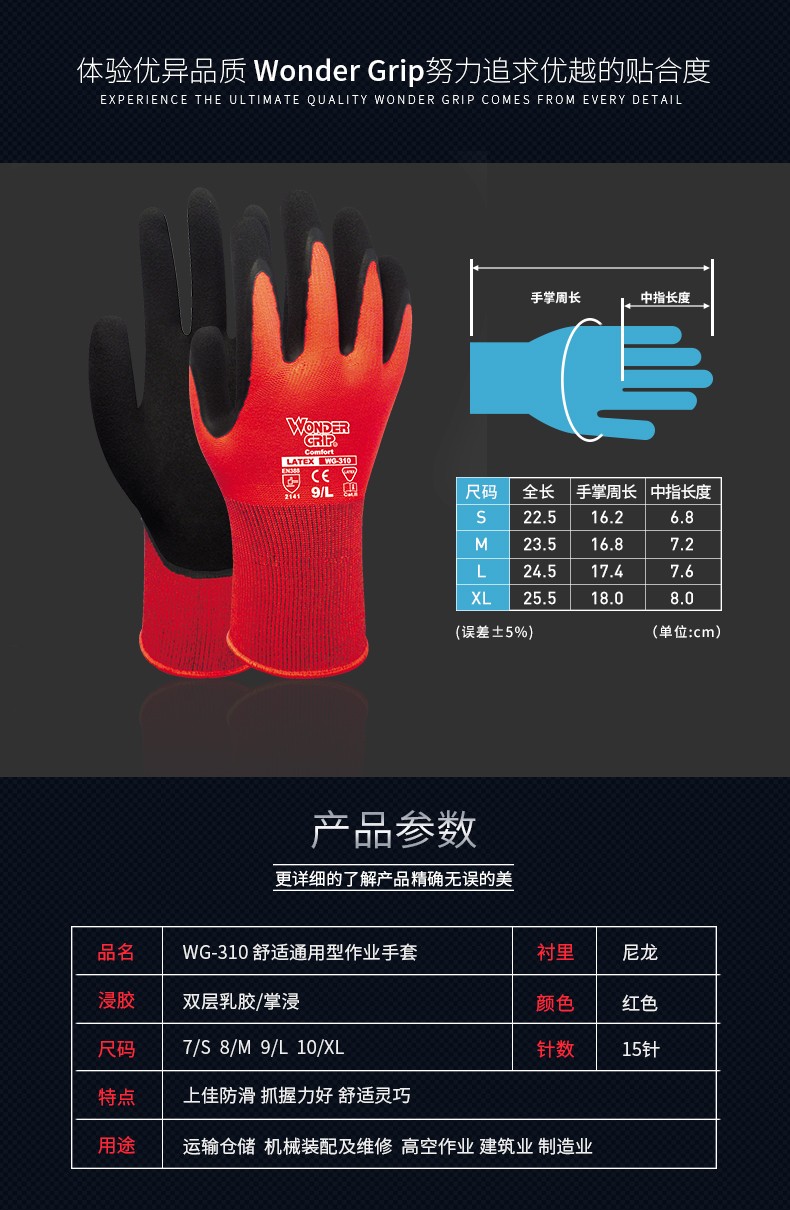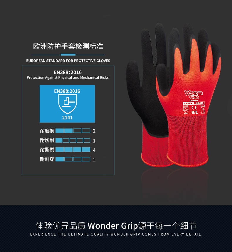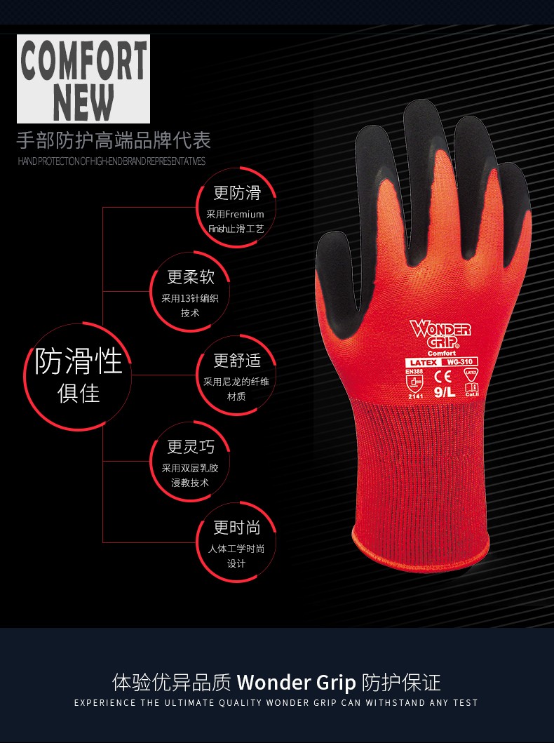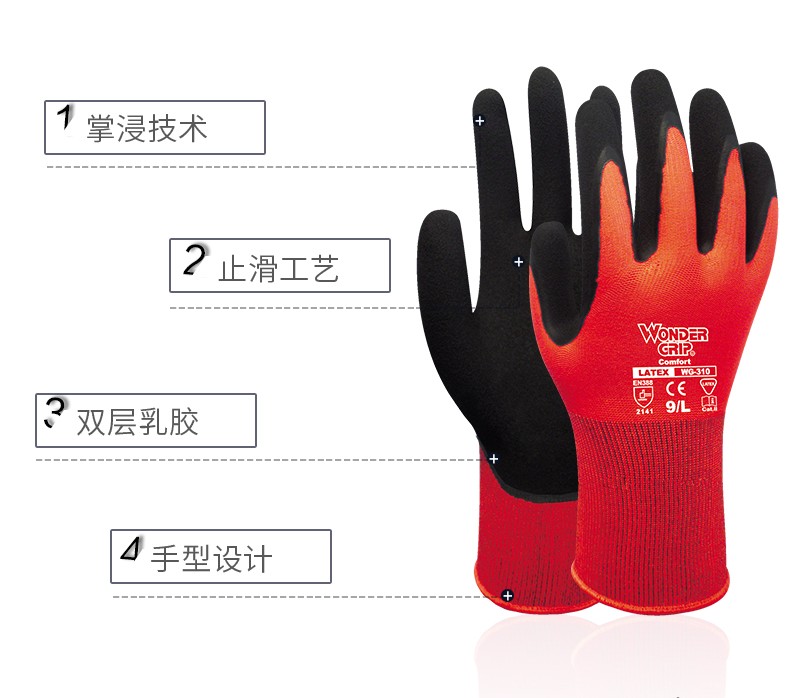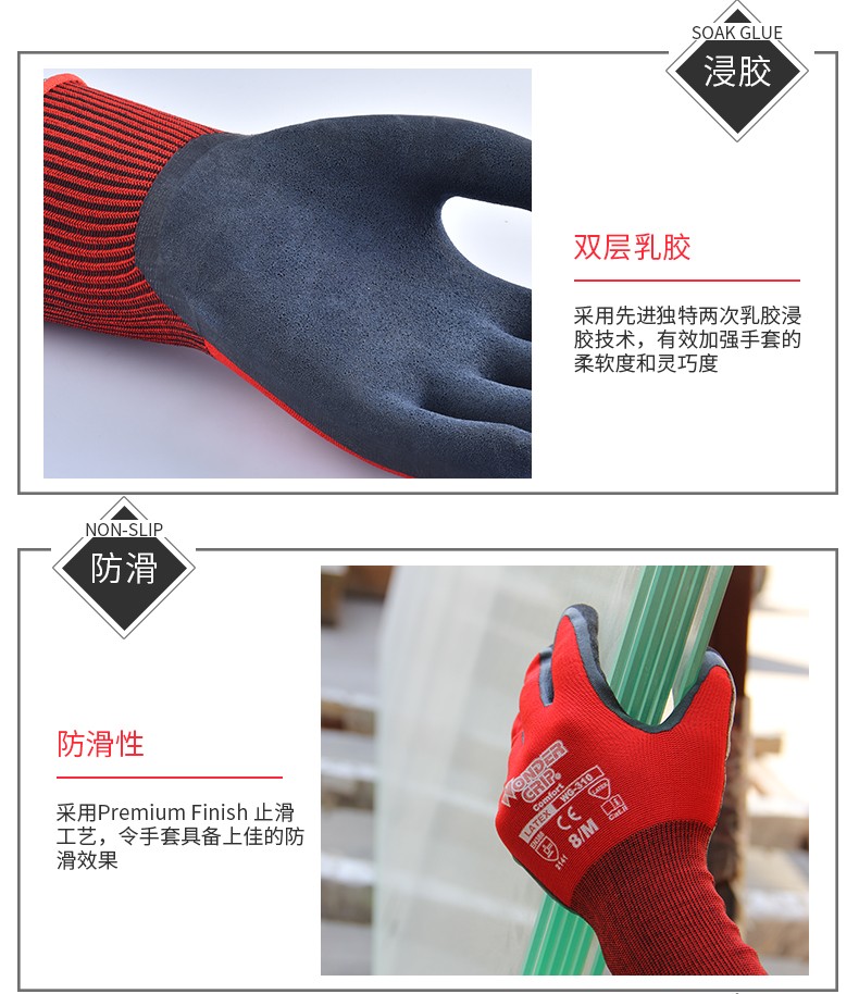 独特两次乳胶浸胶技术与Premium Finish止滑工艺,令手套具备超强防滑效果,为干性和湿性环境提供优异抓握力;