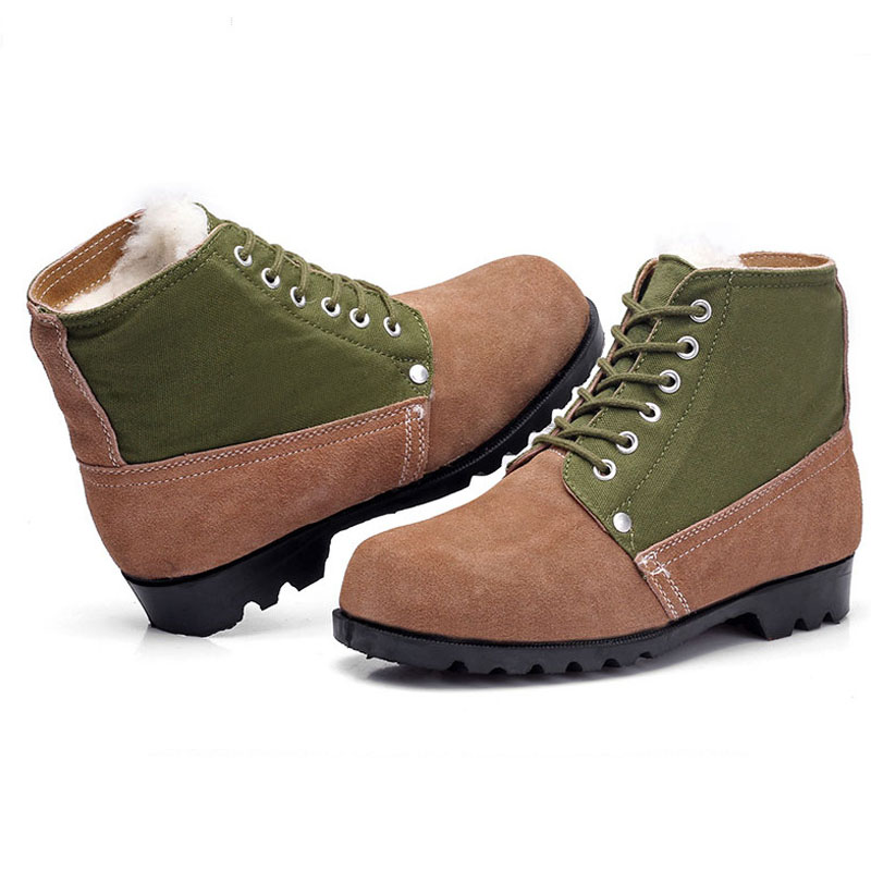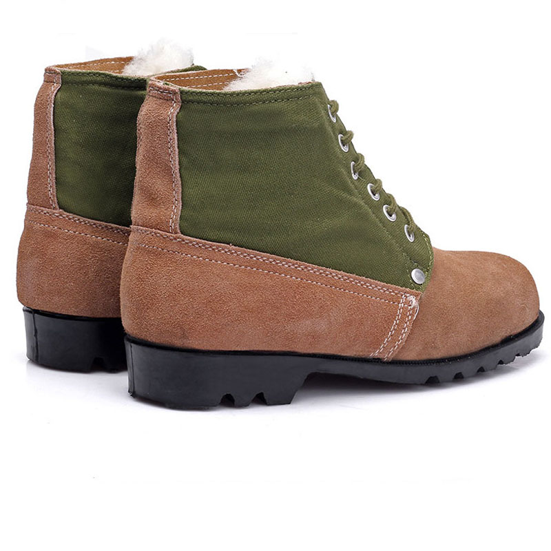 鞋面为反绒牛皮,口部绿色厚帆布,内部大部分为羊毛;