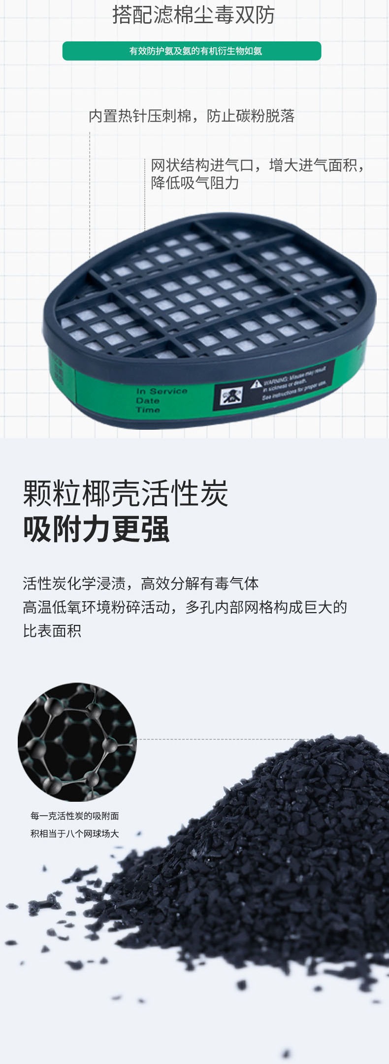 优质椰壳活性炭,防护时间长,吸附值高、活性炭化学浸渍,高效吸附分解有毒有害气体;