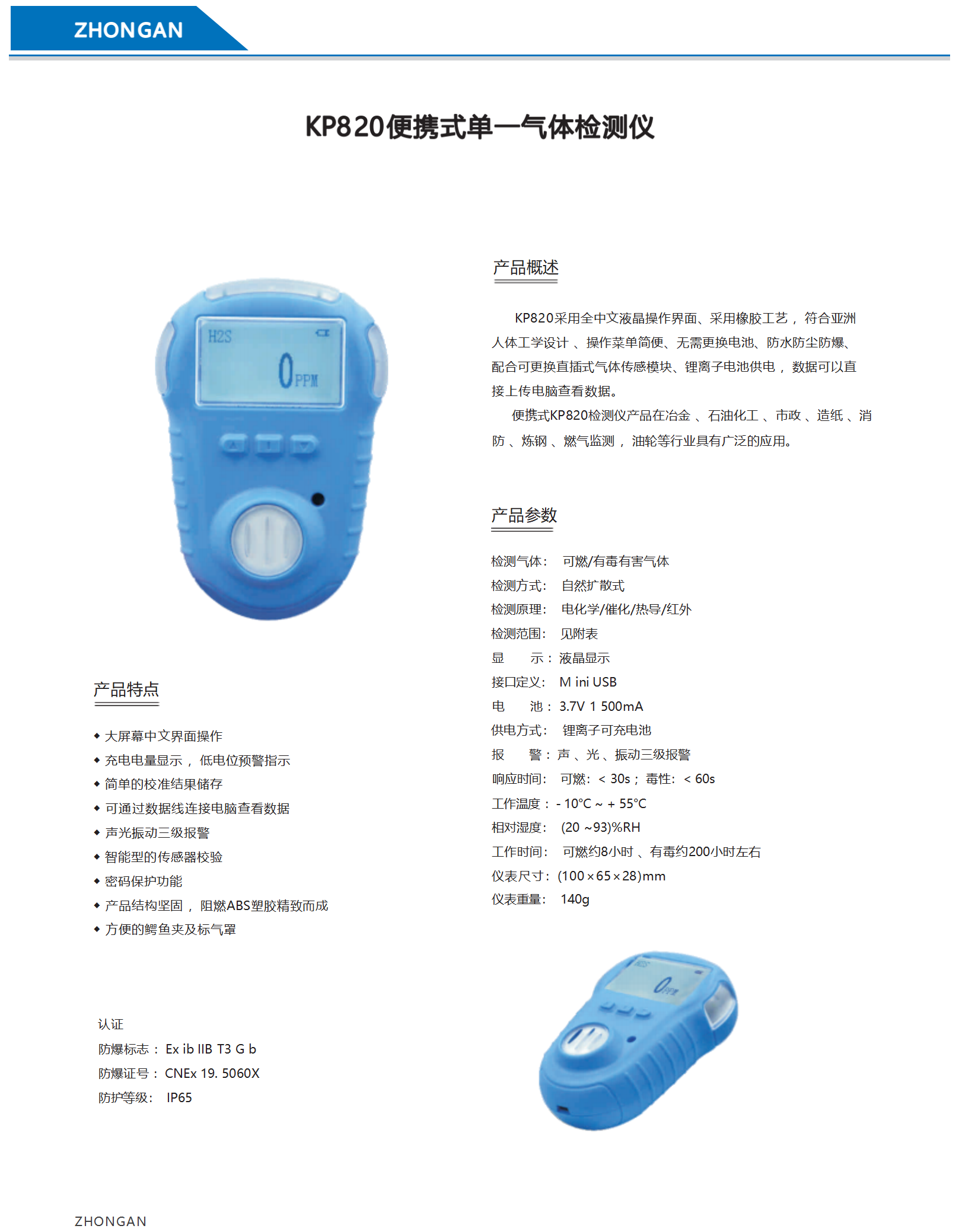 中安 KP820 便携式单一气体检测仪 自然扩散式 二氧化碳 CO2。