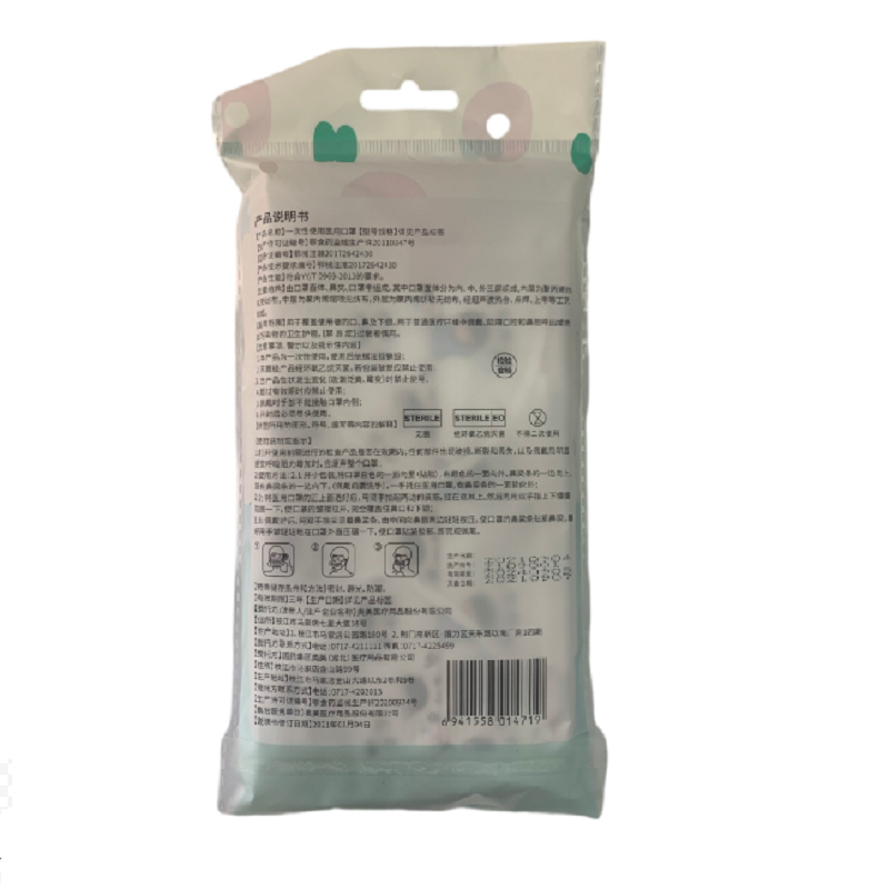 主要结构:由口罩面体、鼻夹、口罩带组成,其中口罩面体分为内、中、外三成组成,内层为聚丙烯热轧无纺布,中层为聚丙烯熔喷无纺布,外部为聚丙烯纺粘无纺布,外层为聚丙烯纺粘无纺布,经超声波热合、点焊等工艺;