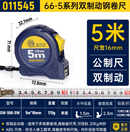 • 商品名称:长城精工 011545 66-5 系列双制动公制带扣卷尺