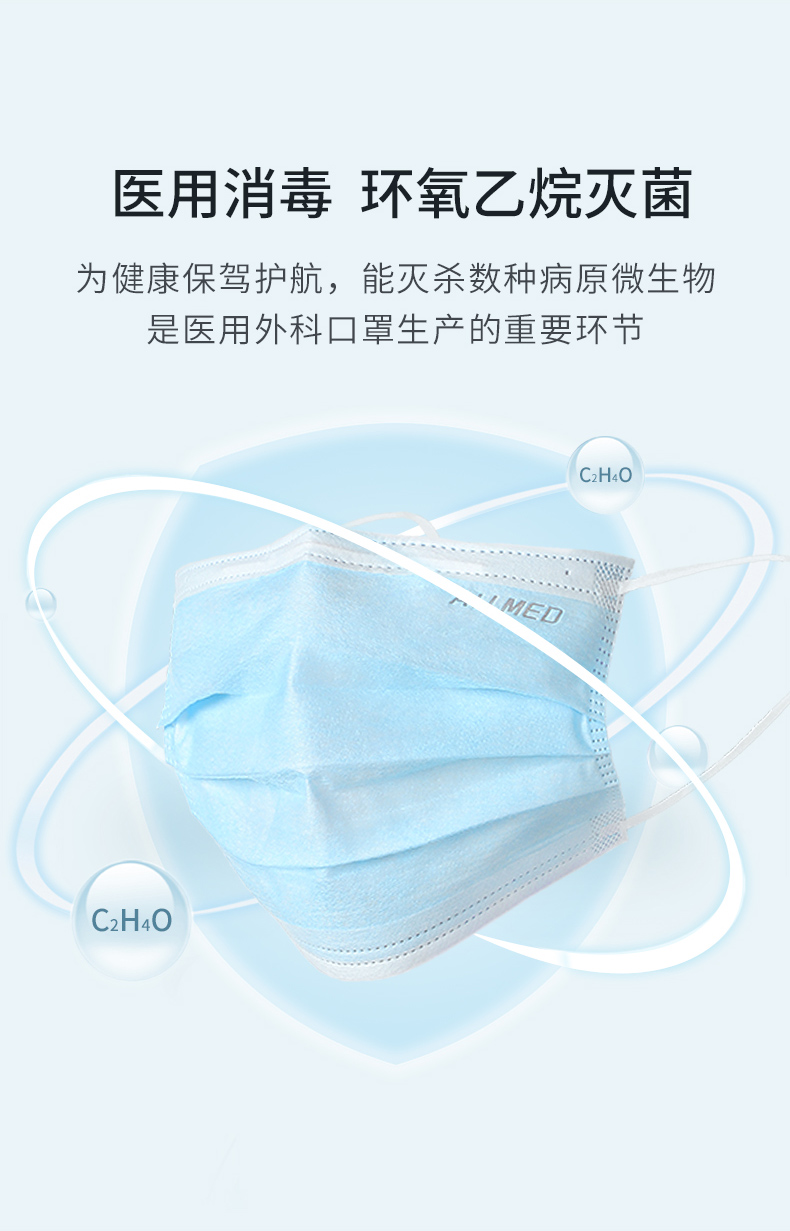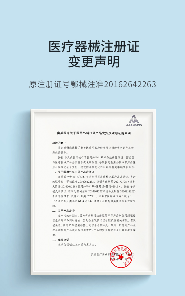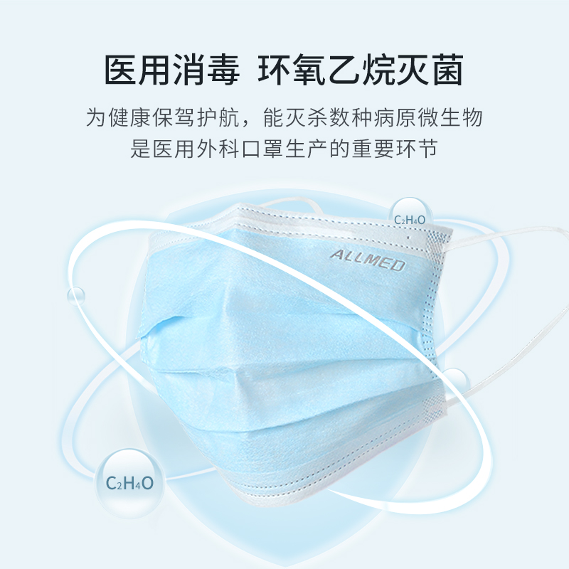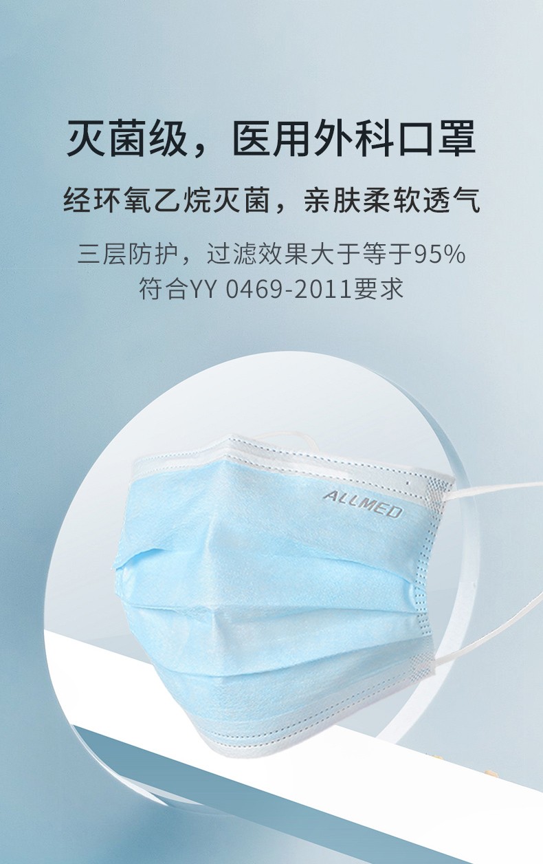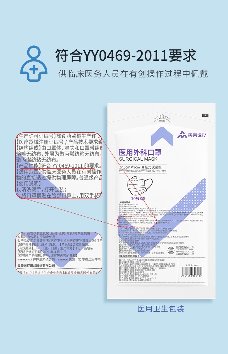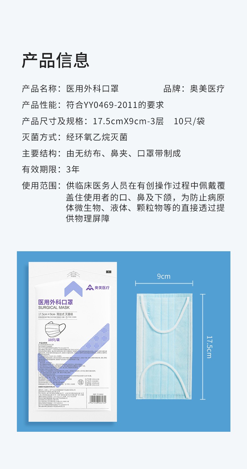 奥美医疗 P110032 医用外科口罩 17.5cm×9cm 耳挂式 蓝色。