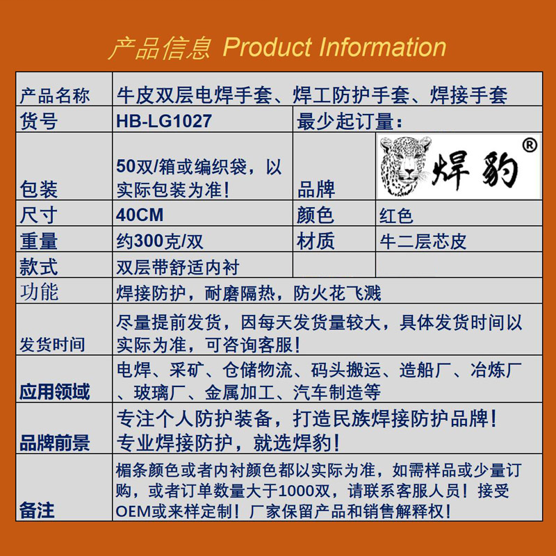 • 商品名称:焊豹 LG1027 红色牛皮双层电焊焊接手套 牛皮防护手套 40CM