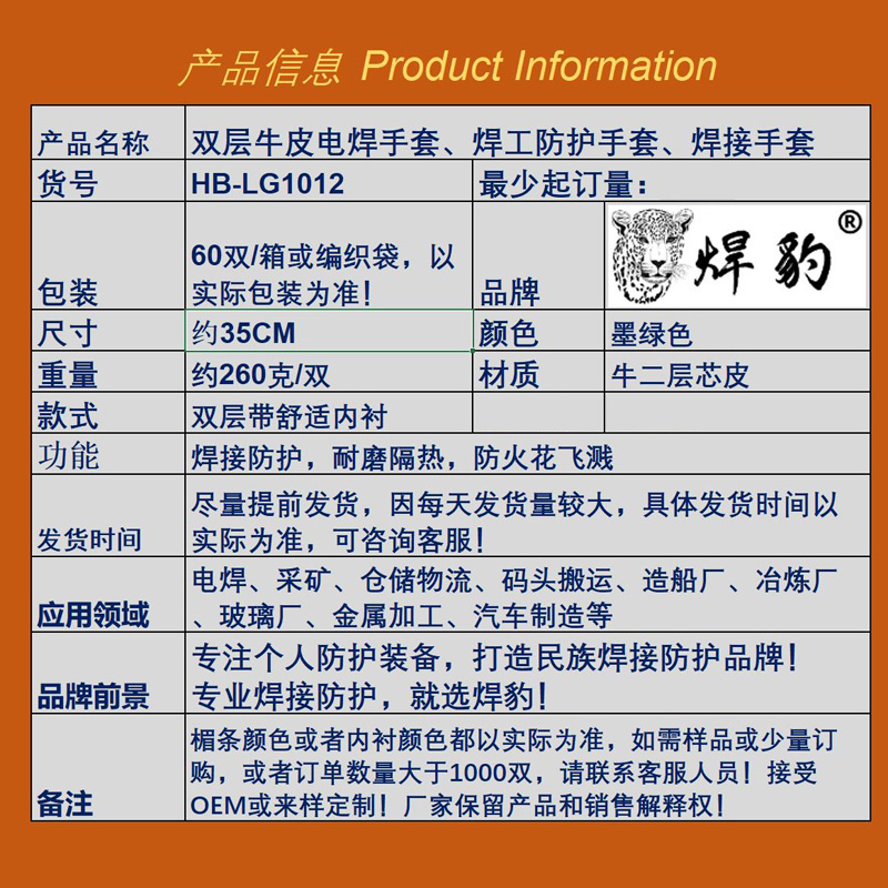 • 商品名称:焊豹 LG1012 墨绿色牛皮双层电焊焊接手套 牛皮防护手套 35CM