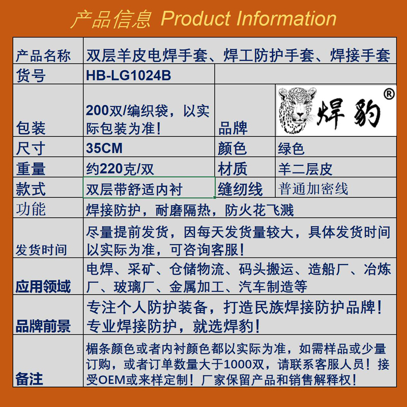 • 商品名称:焊豹 LG1024B 墨绿色羊皮双层电焊焊接手套 羊皮防护手套 35CM
