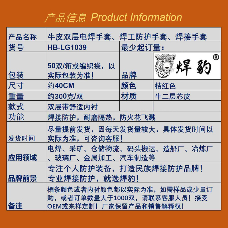 • 商品名称:焊豹 LG1039 桔红色牛皮双层电焊焊接手套 牛皮防护手套 40CM